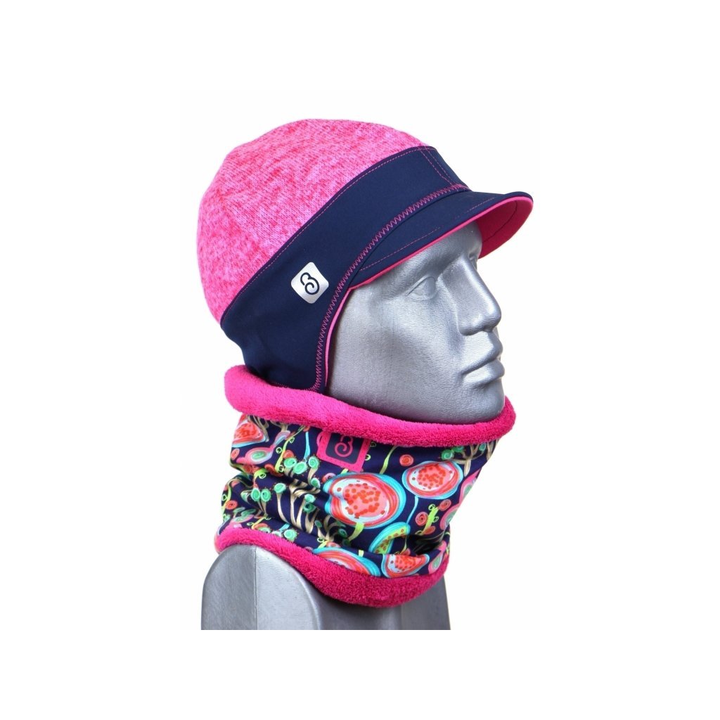 Praktická sportovní čepice je ušitá s kombinace šedé žíhané svetroviny a růžového softshellu.