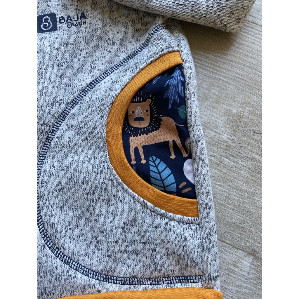 Barva: šedá, žluté náplety, kapsy motiv lvíčci