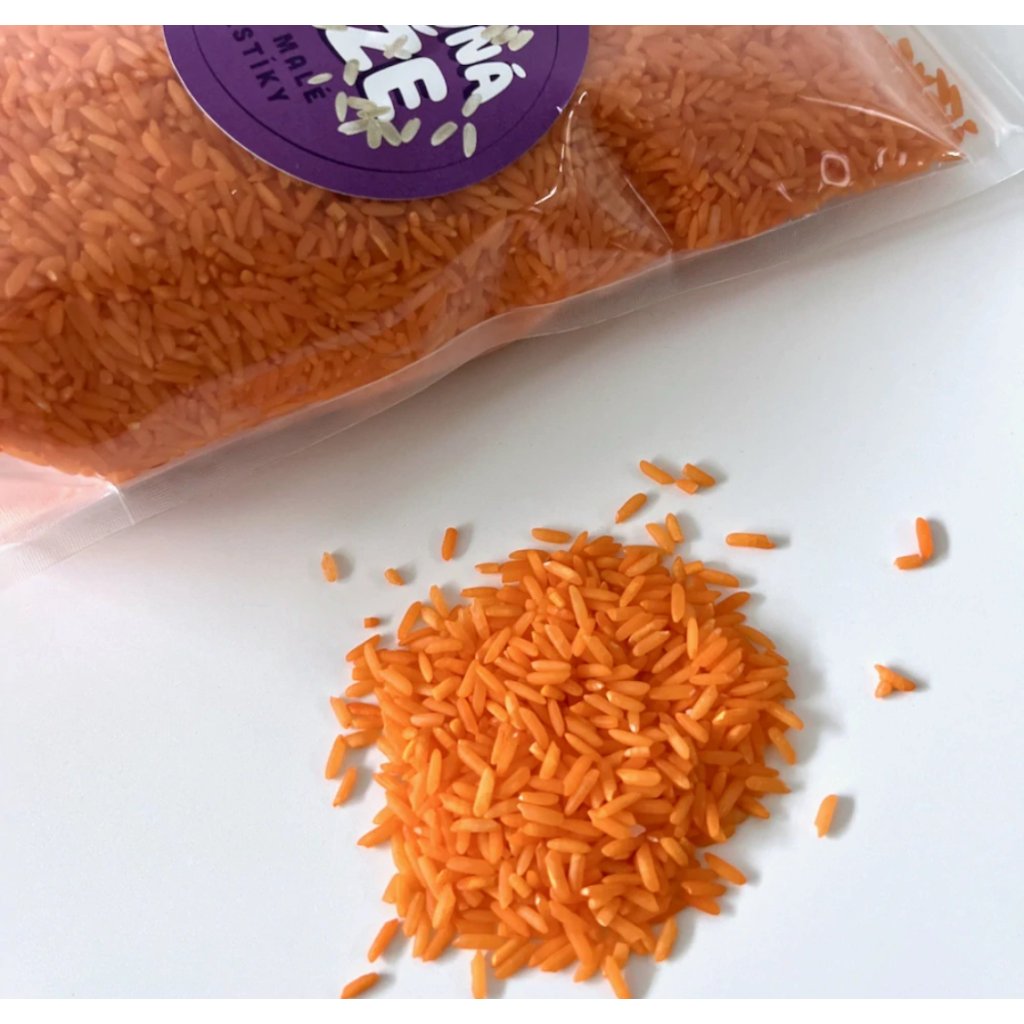 Barevná rýže v oranžovém odstínu je ideální materiál pro smyslové hraní, tvoření i třídění. Děti si při přesypávání, nabírání nebo schovávání drobných předmětů přirozeně rozvíjejí jemnou motoriku, soustředění i fantazii. Skvěle se hodí do senzorických táců, a smyslových aktivit.