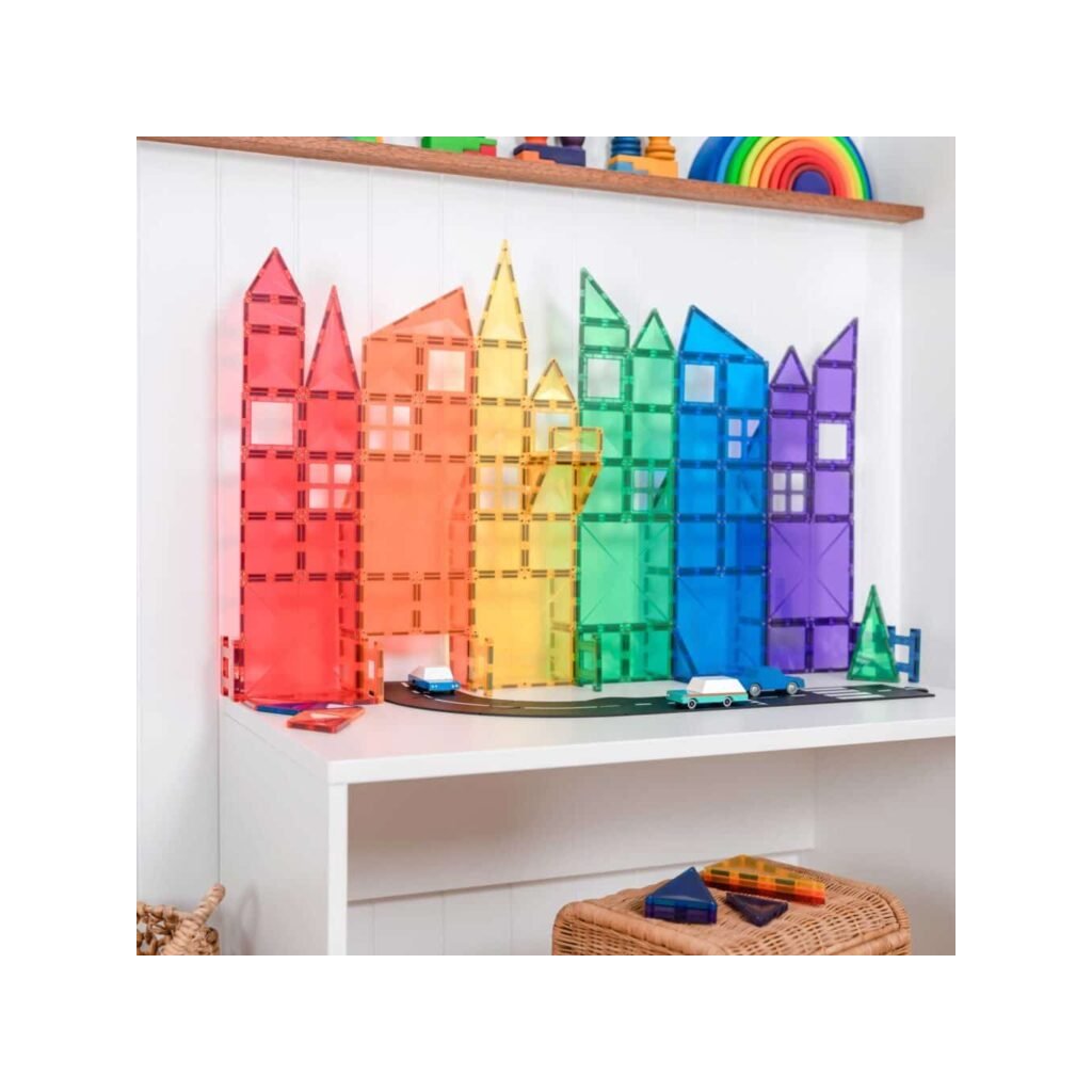 Díky univerzálním rozměrům a pevným magnetům k sobě dílky dokonale pasují, takže děti mohou rozšiřovat své stavby do výšky, šířky i složitosti.