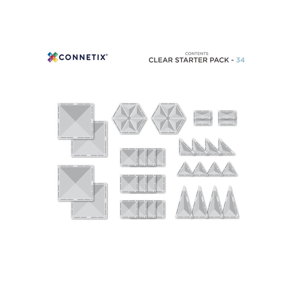 Connetix Clear Starter Pack 34 ks je ideální startovací magnetická stavebnice pro děti od 3 let, které milují tvoření, objevování a nekonečné možnosti stavění. Transparentní magnetické tvary propouštějí světlo, takže děti mohou stavět ledové hrady, iglú, okna, skleníky nebo fantazijní křišťálové světy.