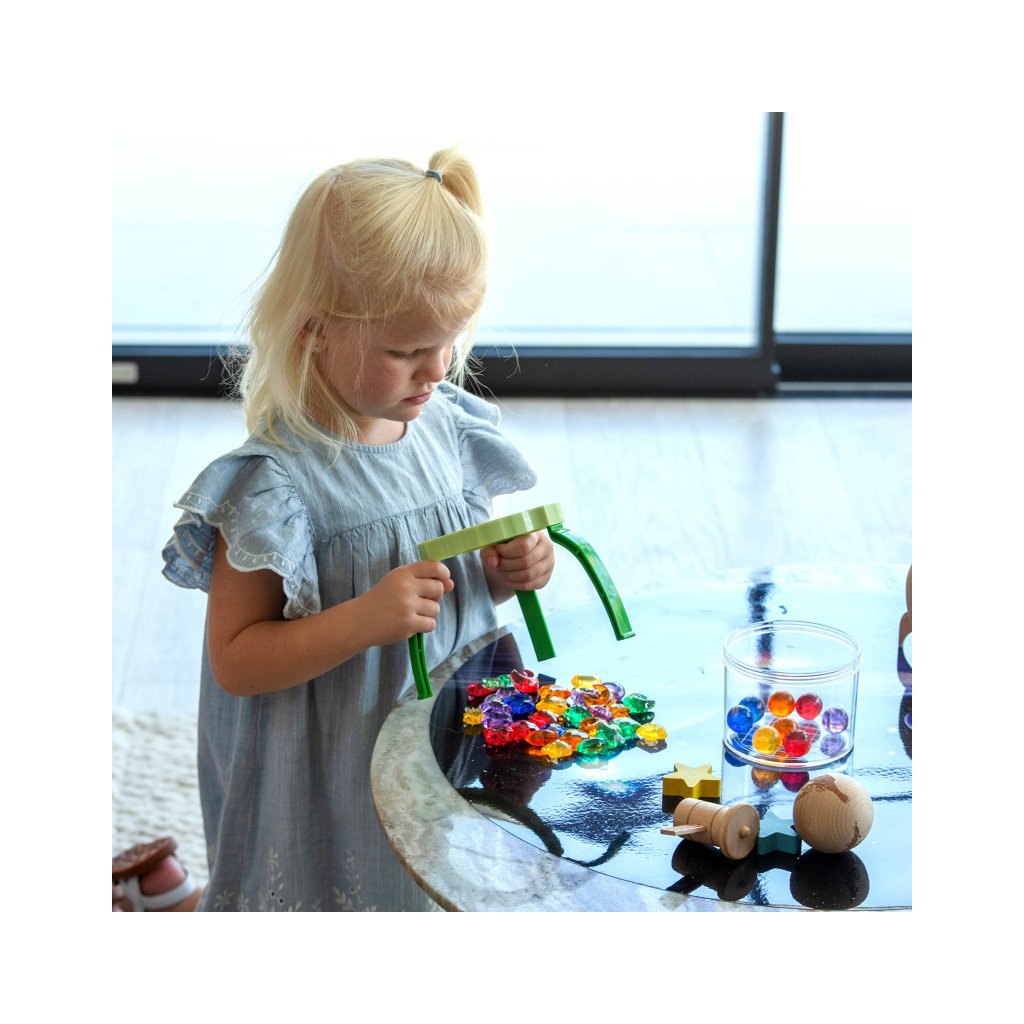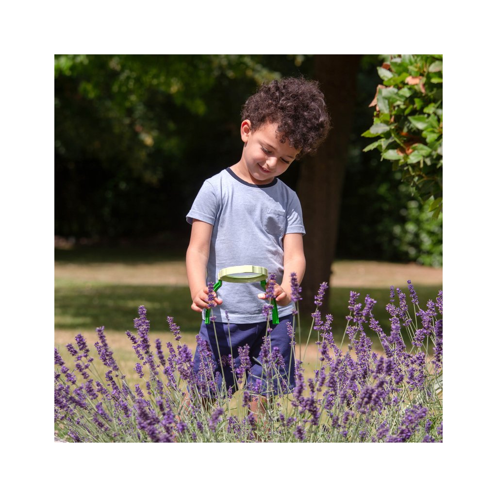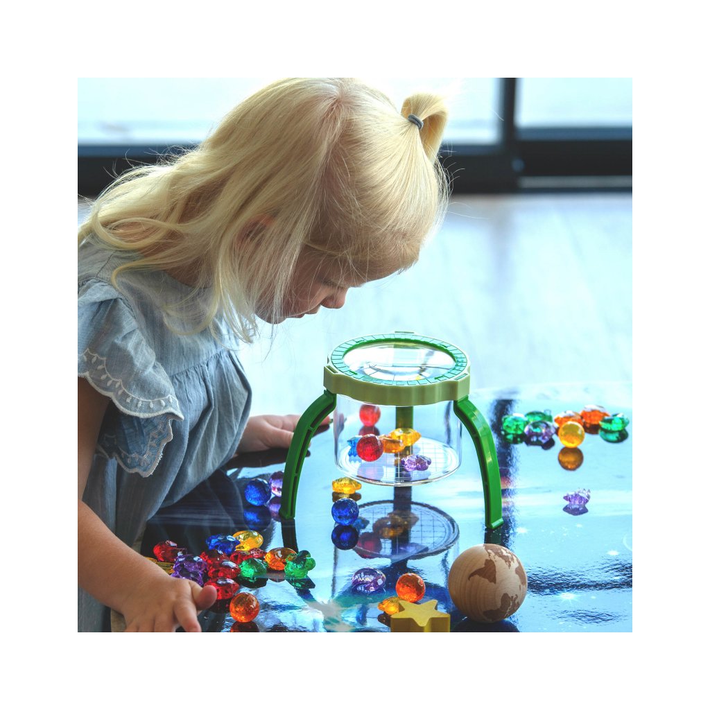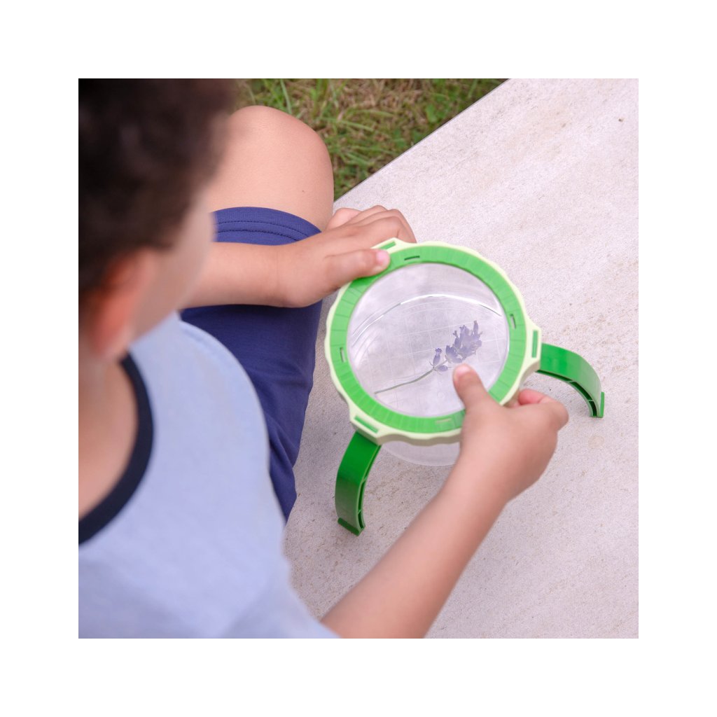 Díky stabilnímu stojanu mohou děti pozorovat drobné detaily bez nutnosti držení lupy v ruce. To je ideální pro malé objevitele, kteří chtějí zkoumat přírodniny, hmyz, listy, mušličky nebo materiály ve smyslovém tácu. Lupa se zvětšením 2× pomáhá dětem vidět svět zblízka a podporuje hlubší soustředění při hře.