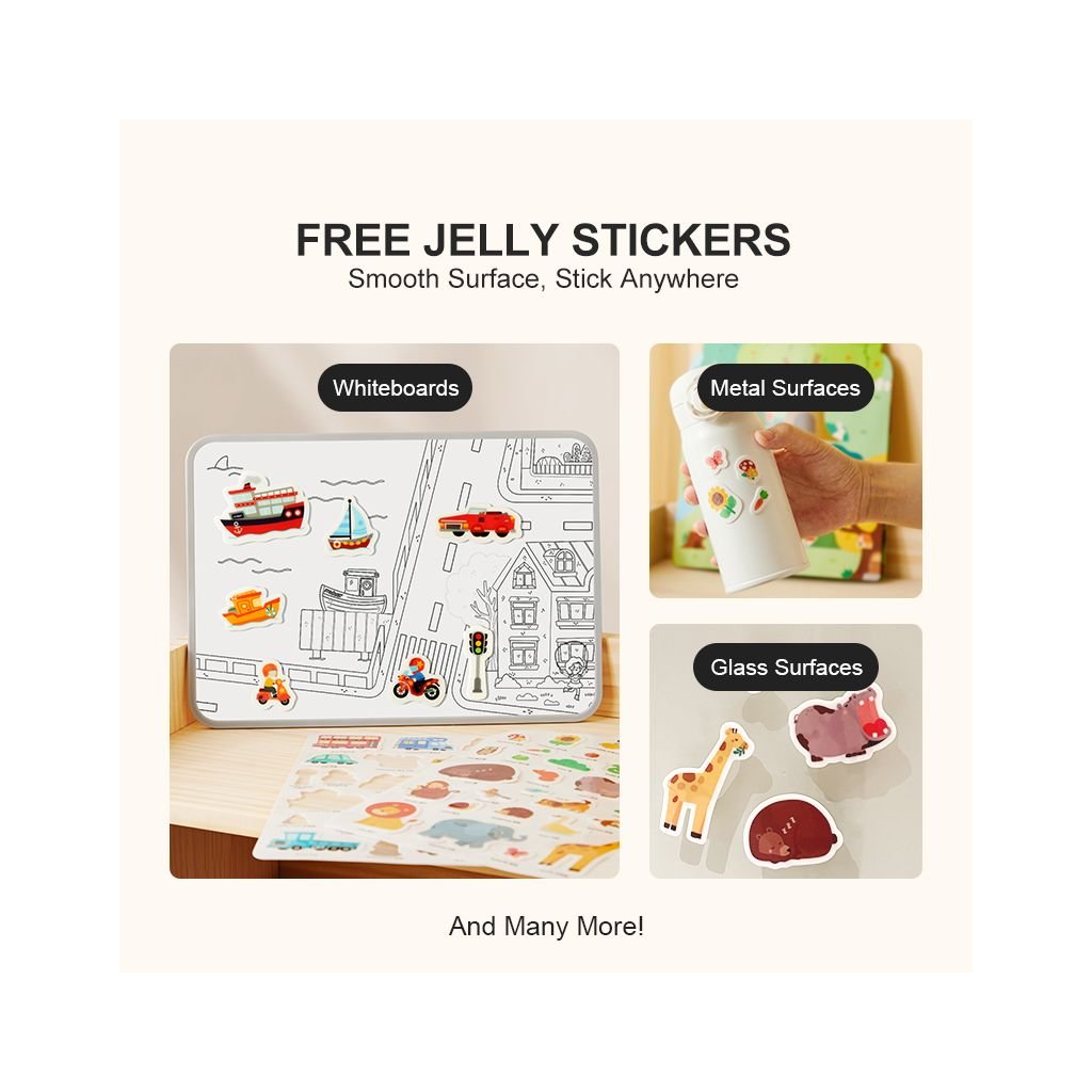 Gelové samolepky se snadno odlepují, jsou bezpečné, netoxické a ideální pro malé prstíky, které teprve objevují přesnou manipulaci. Knížka navíc obsahuje speciální stránku pro odkládání samolepek, aby se žádná neztratila.