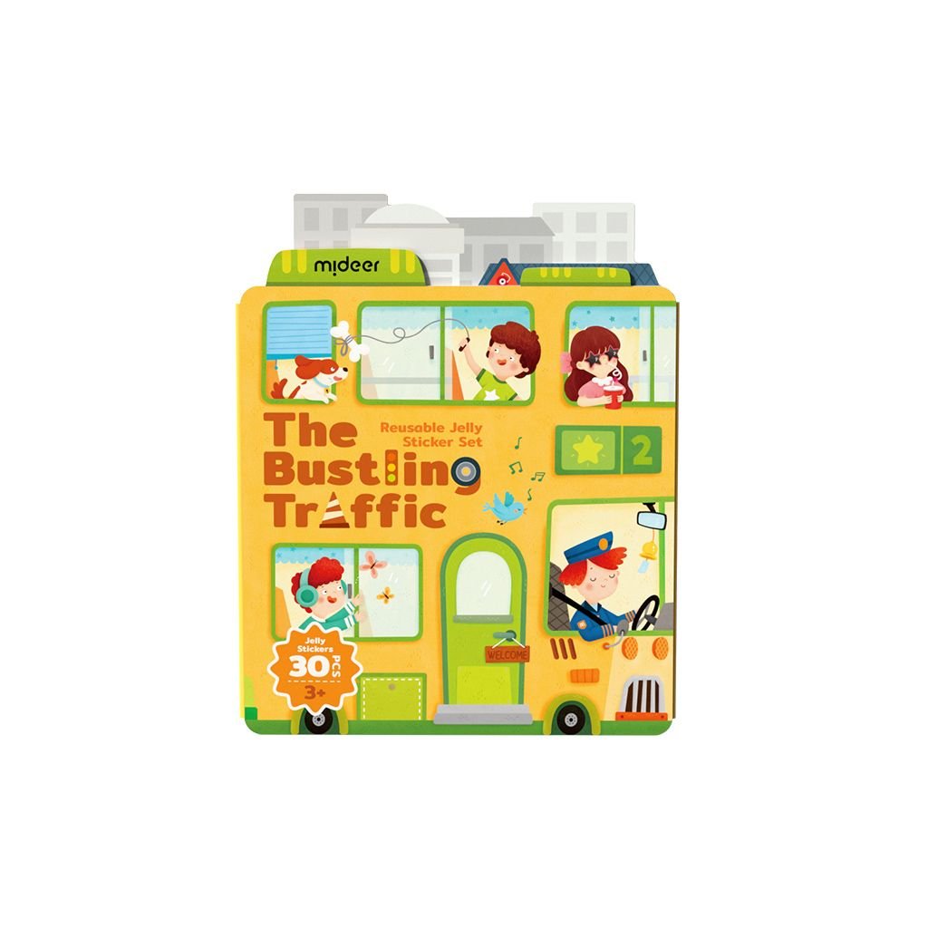 Dětská kreativní hra se samolepkami – Provoz ve městě nabízí otevírací knížku s ilustracemi ulic, křižovatek, semaforů a typických městských kulis. Součástí je arch gelových samolepek vozidel, dopravních značek a městských prvků, které mohou děti neustále přemisťovat, lepit a znovu odlepovat.