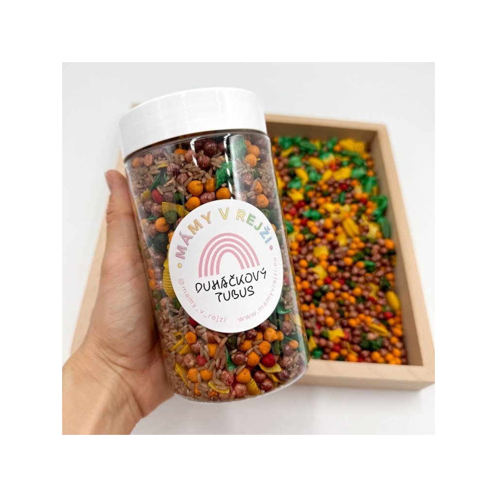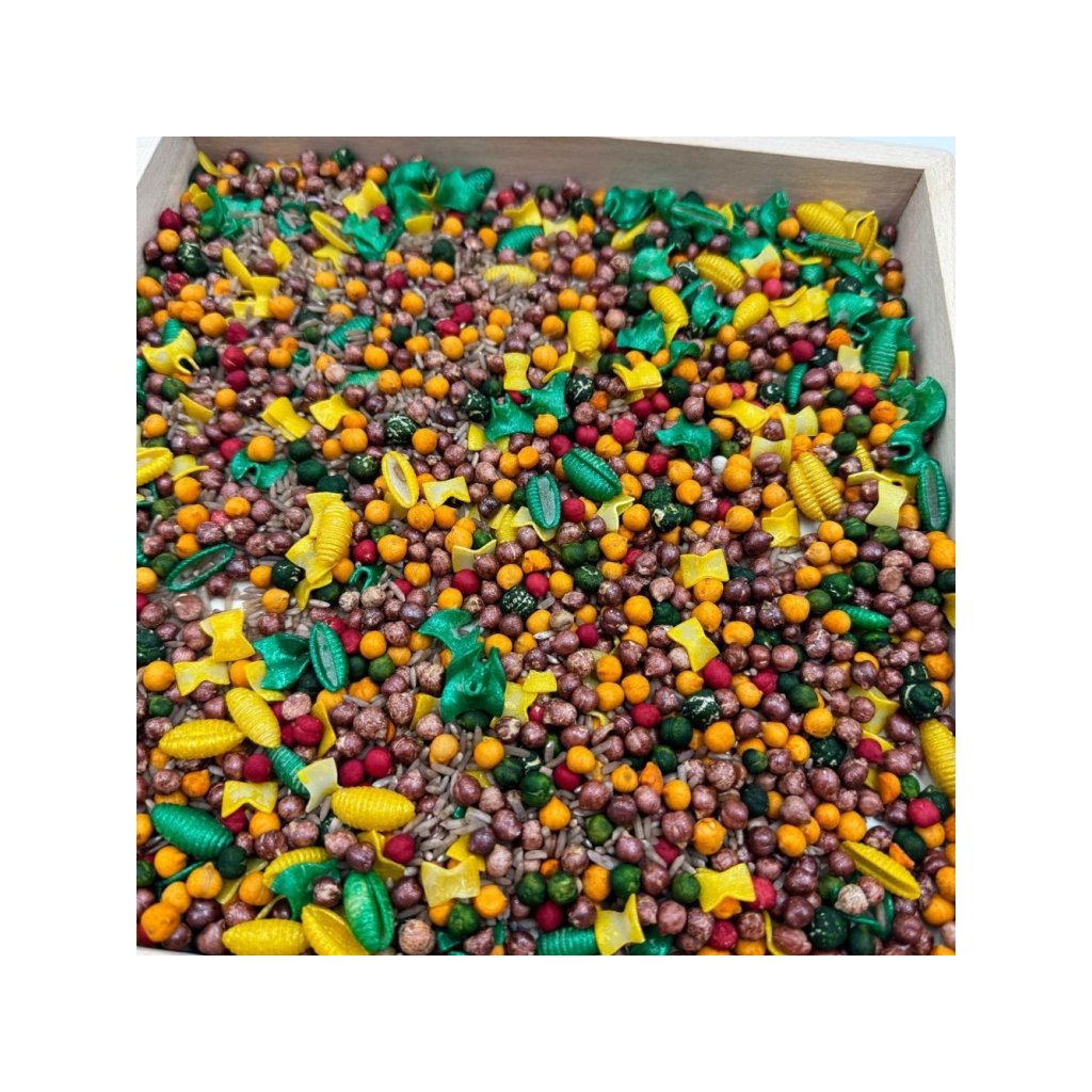Barevný sypký materiál, který promění obyčejnou hru v kouzelné dobrodružství! V 660g balení najdete rýži, cizrnu a rozmanité těstoviny obarvené potravinářskou a akrylovou barvou v podzimních tónech.