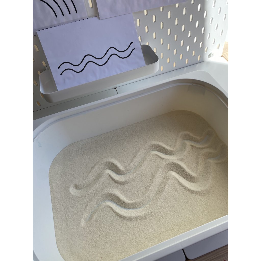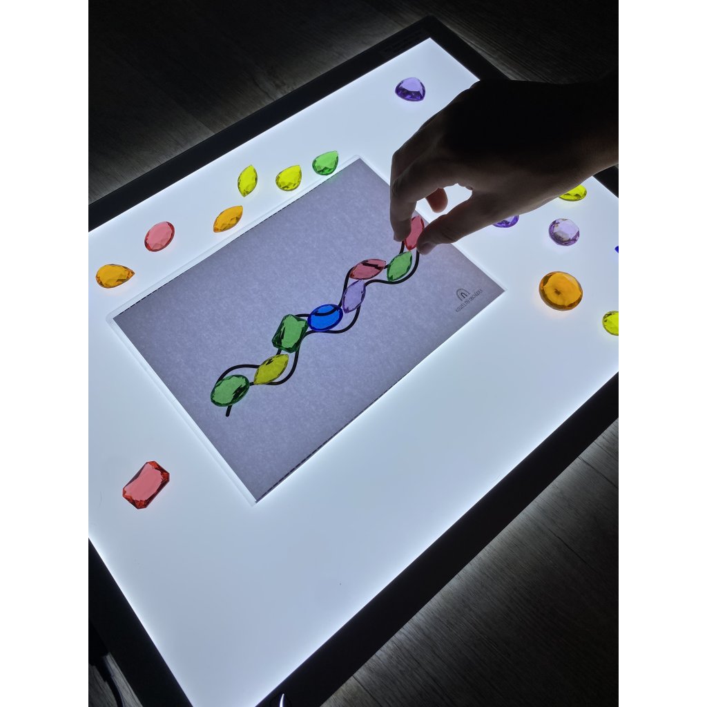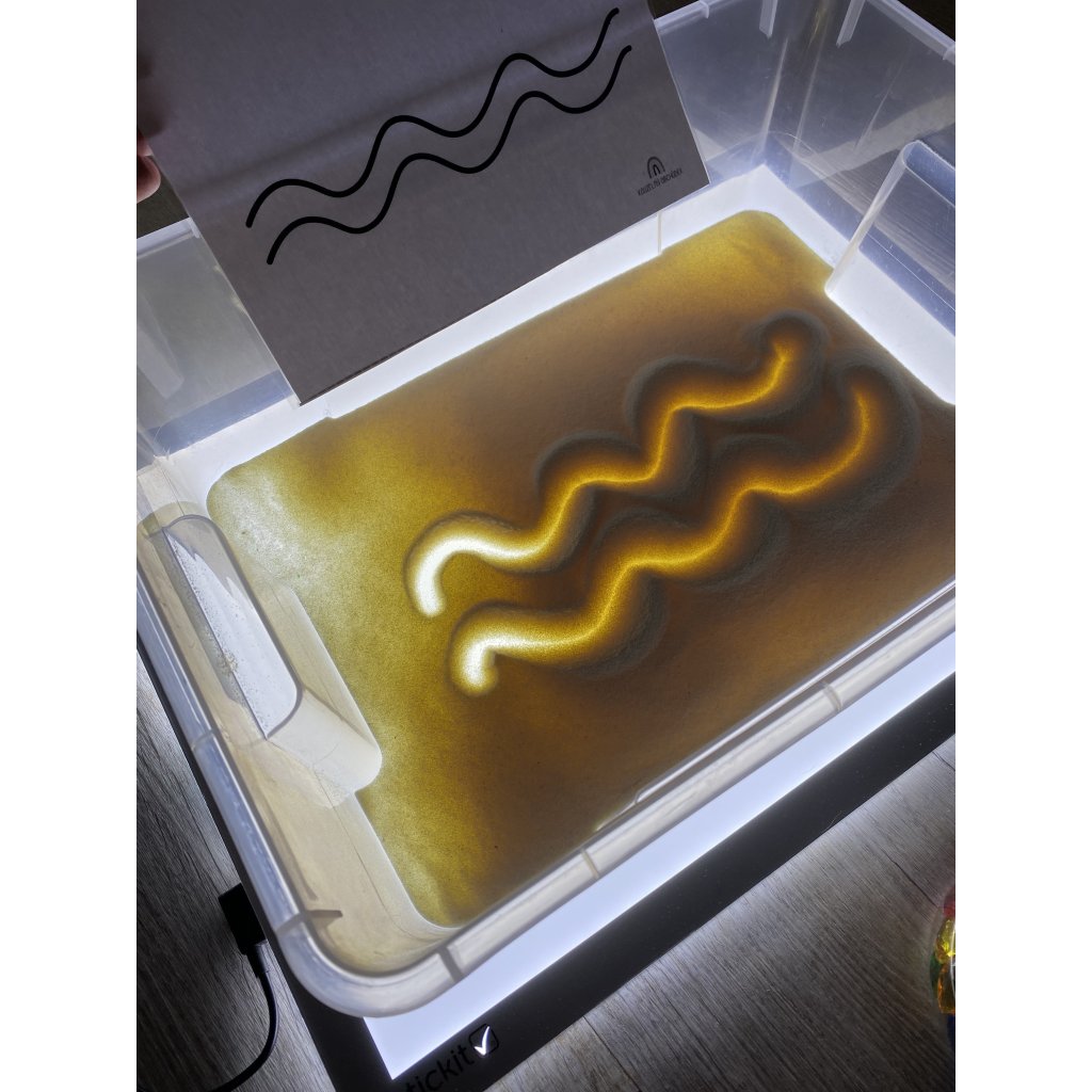 Použijte Light panel a nízkou nádobu, do které nasypete mouku nebo písek. Před to položte předlohy. Děti mohou prstíkem malovat podle předloh čary sledovat tvary. Tato aktivita rozvíjí hmotovou citlivost ruky, vizuální koordinaci a koncentraci.