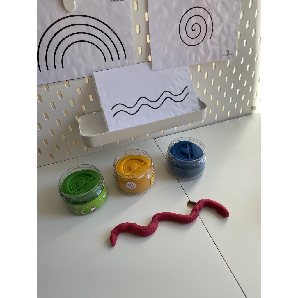 Děti mohou linky a tvary z předloh přetvořit pomocí modelíny. Stačí, když budou prsty či válečkem tvarovat čáry podle předlohy. Tato aktivita posiluje prstovou sílu, preciznost pohybu a kreativní myšlení.
