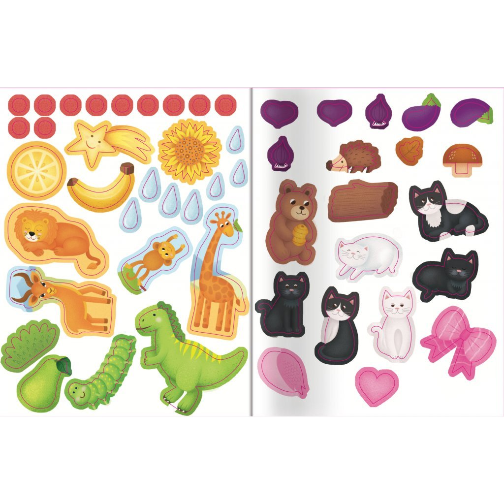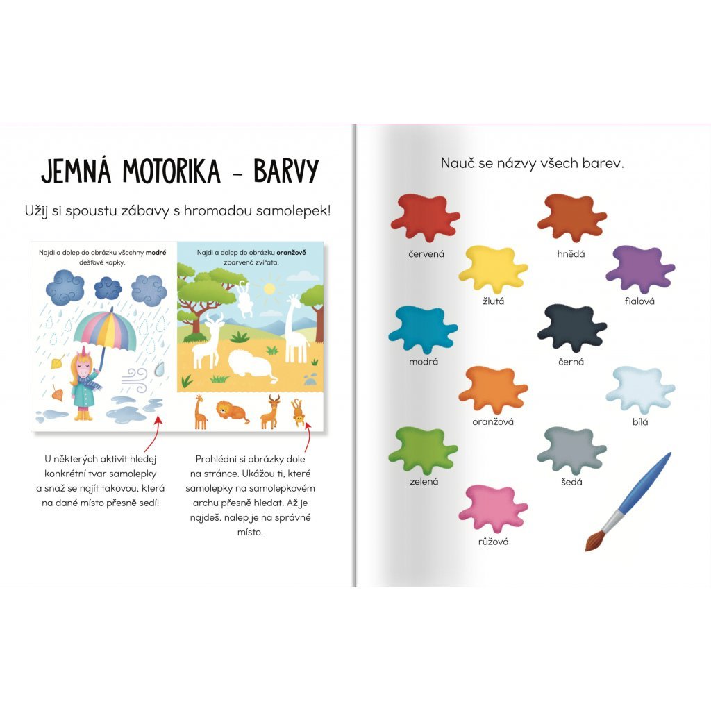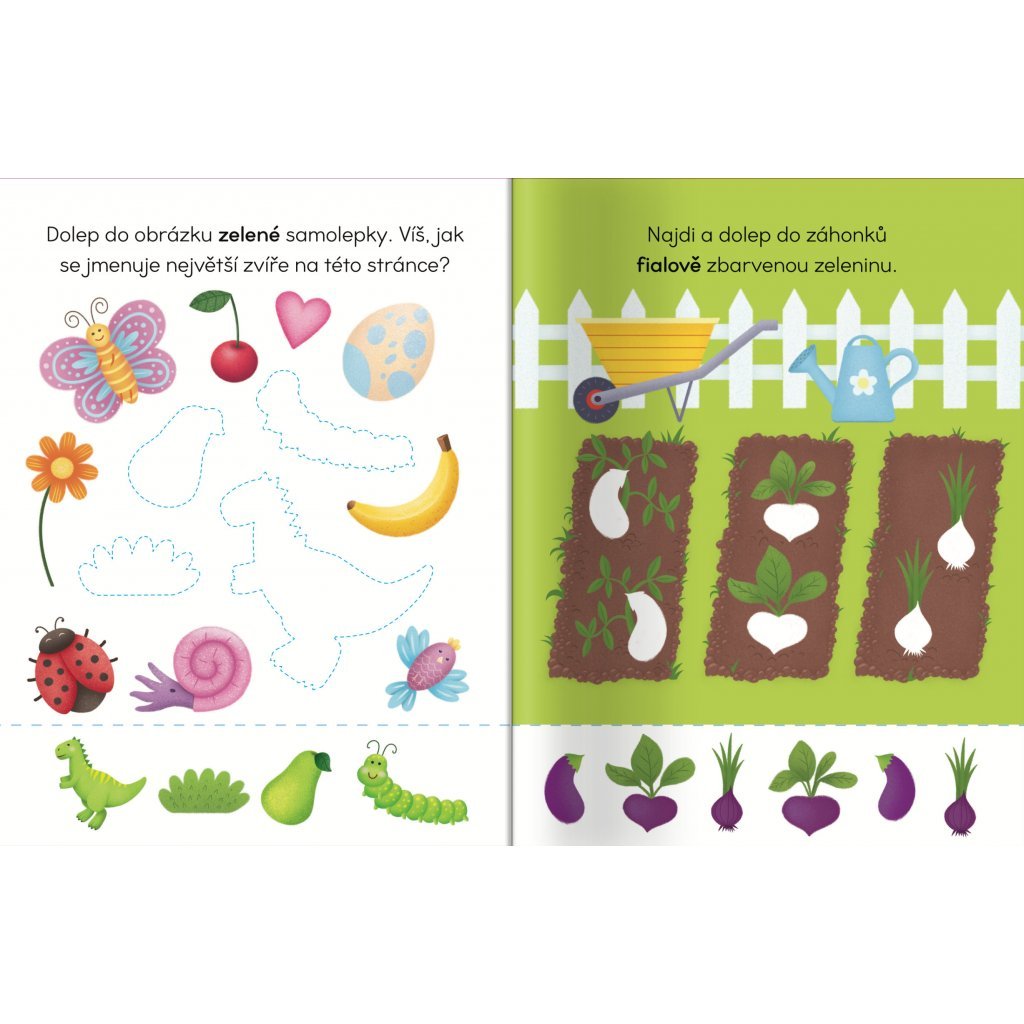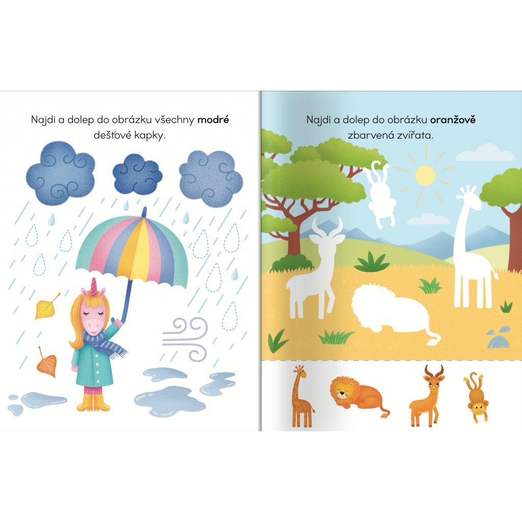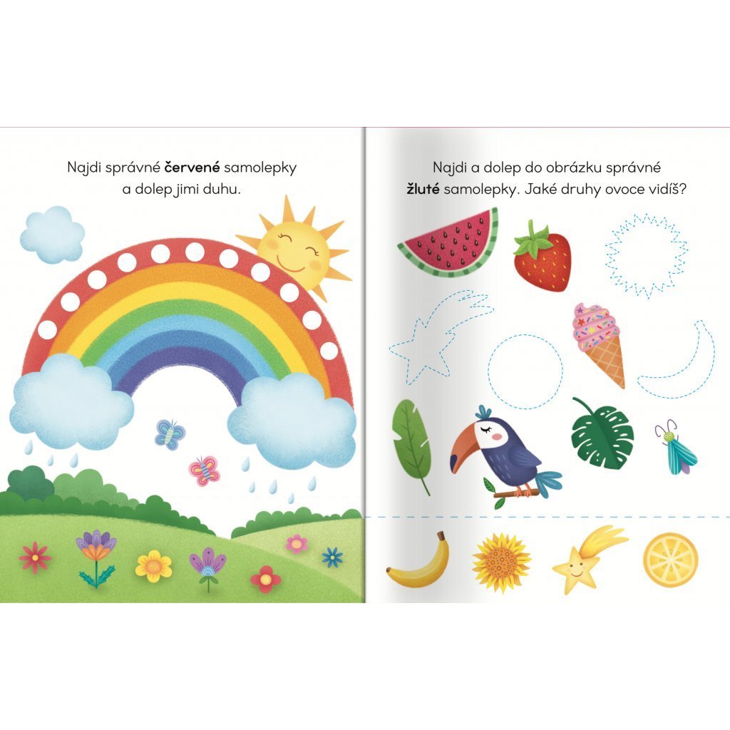 Tento pestrobarevný pracovní sešit učí děti poznávat barvy. Kreativní aktivity na přiřazování a doplňování posilují schopnost učit se a rozlišovat barvy a tvary. Na každé stránce nalepují děti konkrétní samolepku na vyznačené místo a dokončují tak obrázky. Toto napomáhá rozvíjet soustředění, schopnost rozlišovat rozdíly a jemnou motoriku.