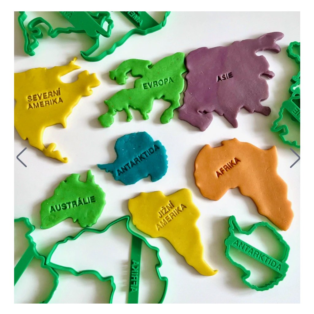 S touto sadou vykrajovátek mohou děti hravou formou poznávat tvary jednotlivých kontinentů a jejich názvy, čímž si přirozeně rozšiřují geografické znalosti. Každé tvořítko je ideální ke hře s modelínou nebo kinetickým pískem. Skvělá pomůcka a doplněk pro senzorické smyslové hraní, rozvíjí jemnou motoriku a fantazii.