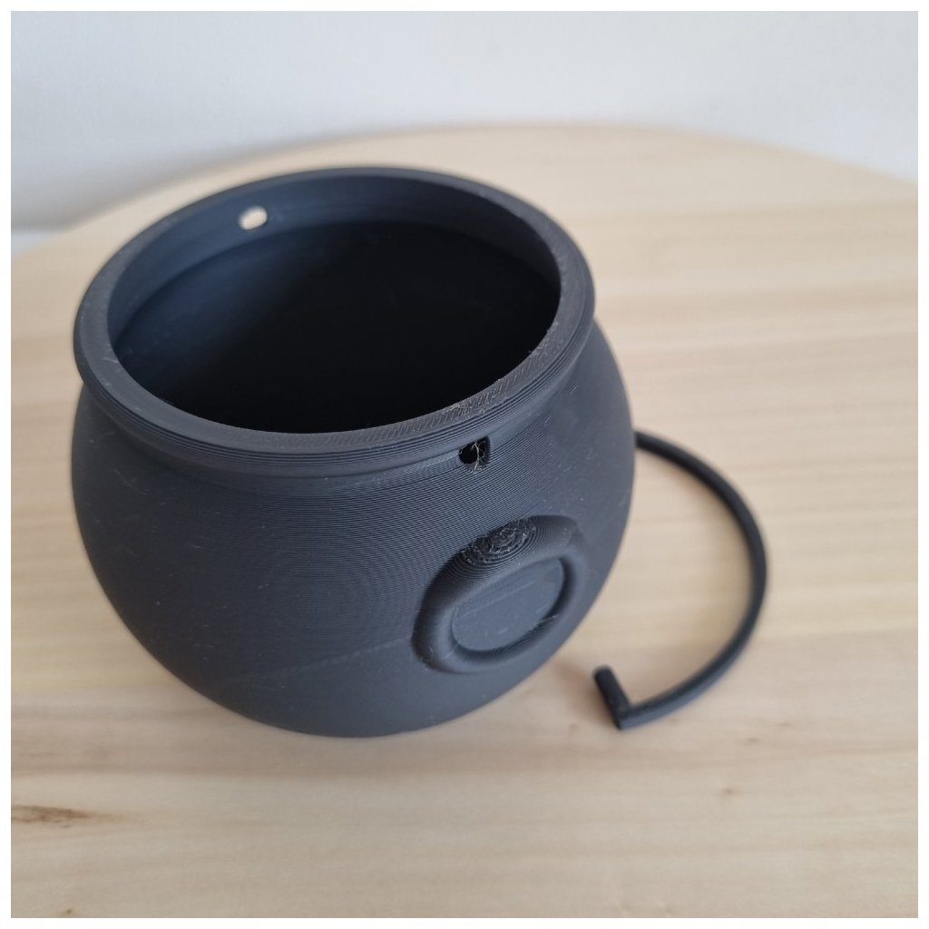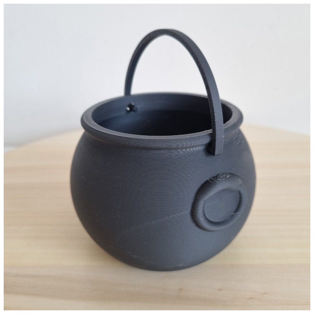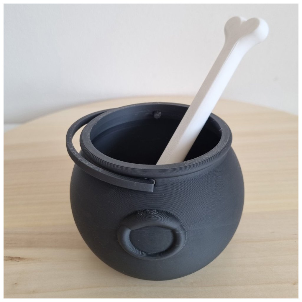 Kotlík s uchem o velikosti 10 cm je skvělým pomocníkem pro malé čaroděje a čarodějky. Děti v něm mohou míchat barevné elixíry, zkoumat reakce prášků BubleTo nebo si jen hrát na kouzelnickou laboratoř. Jako víčko můžete použít tuto pavučinku a lektvary míchejte pomocí tématické naběračky ve tvaru kosti.