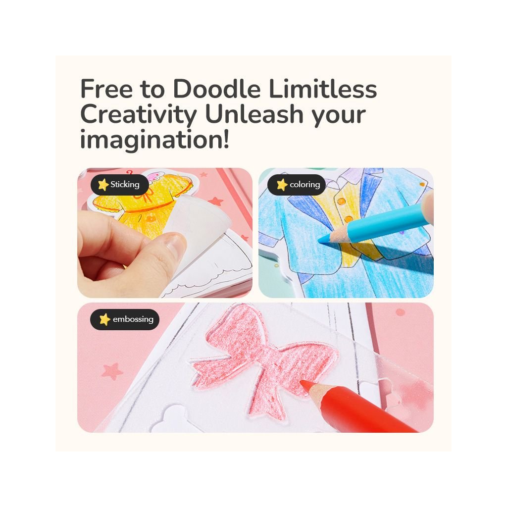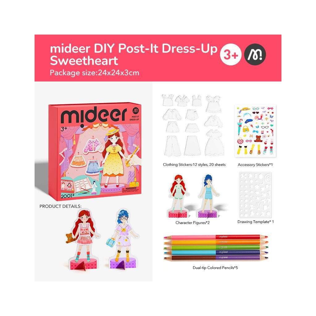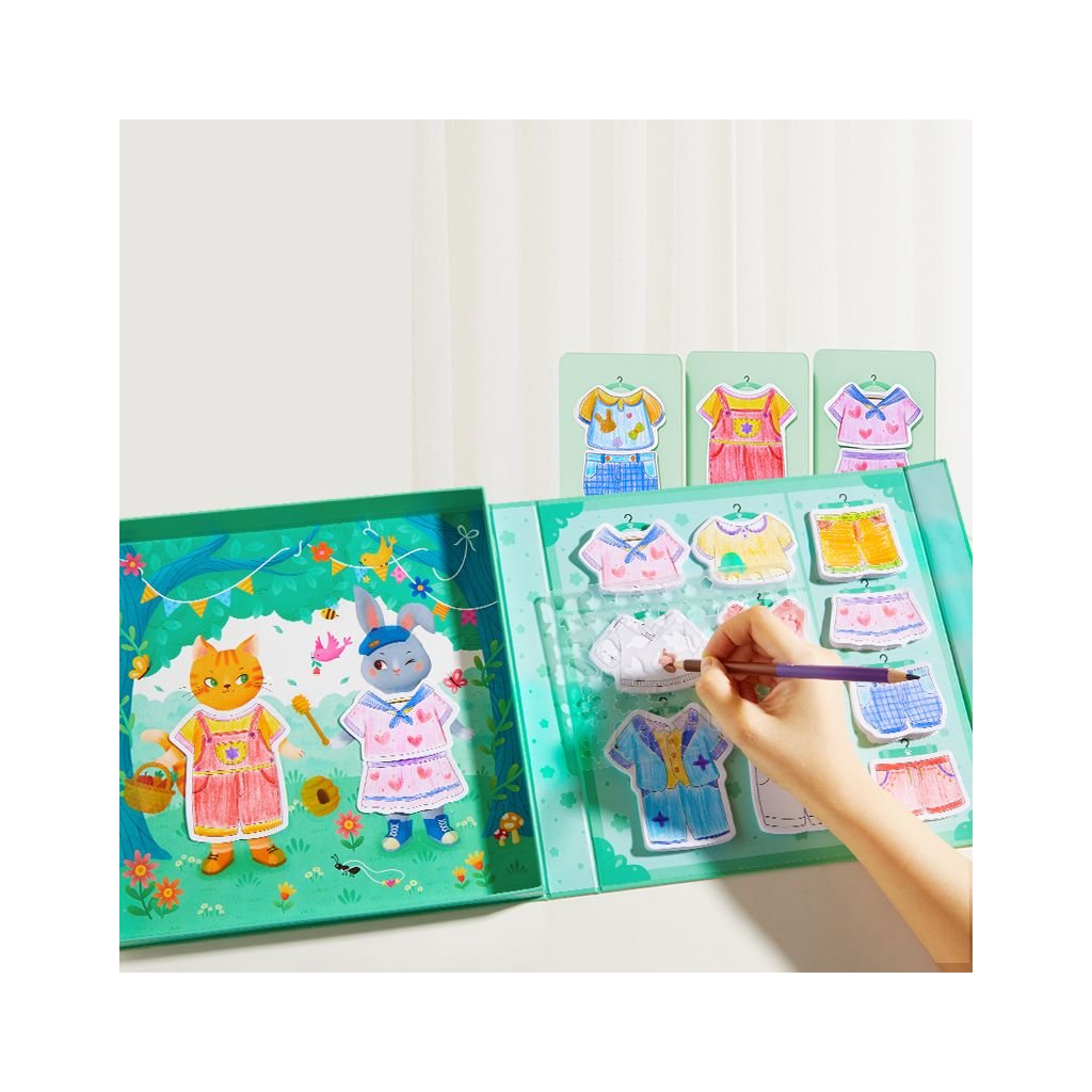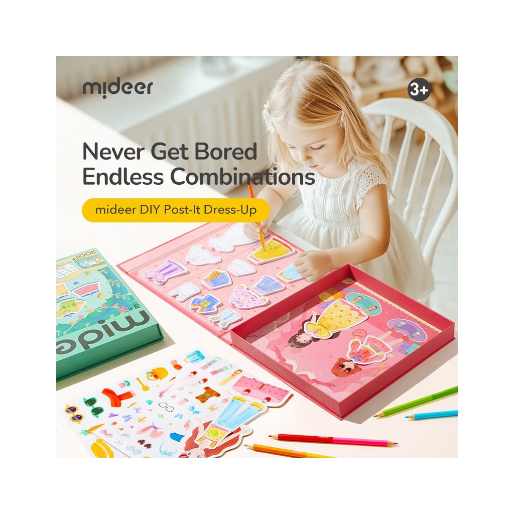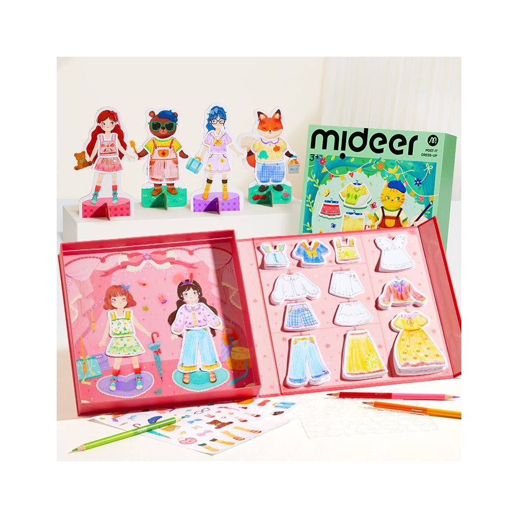 Mideer Oblékání panenek je kreativní sada, která dětem otevírá dveře do světa módy. Pomocí samolepek, barevných pastelek a obrysových šablon si mohou sami navrhovat, kombinovat a dotvářet oblečení podle vlastní fantazie.