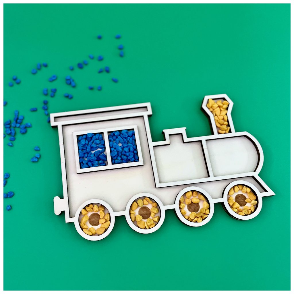 Třídící dřevěný tác ve tvaru lokomotivy – Pomůcka pro smyslovou hru (sensory play)