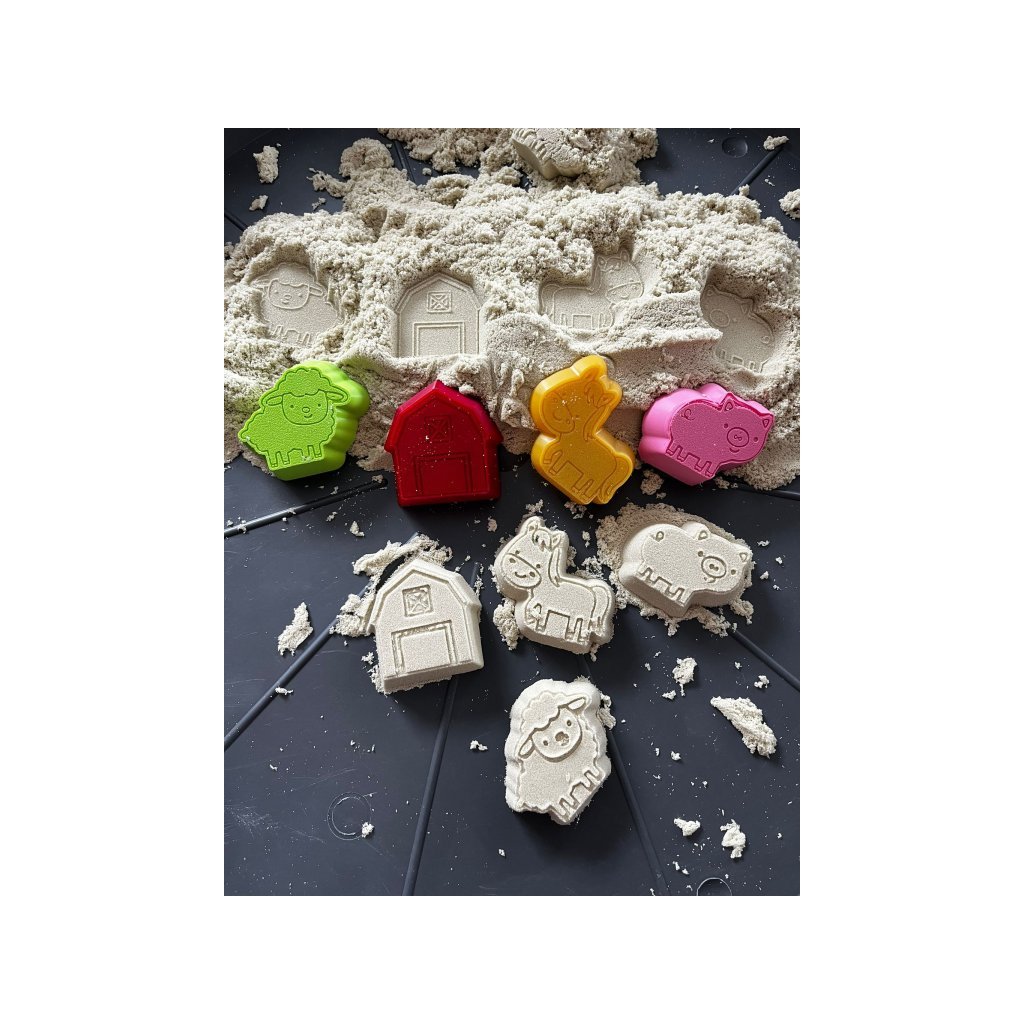 Stačí vzít hrst kinetického písku, vtlačit ho do bábovičky a hned vznikne malá koník , prasátko, ovečka nebo stodola! Děti mohou stavět celé farmy, kombinovat zvířátka a vozidla, „péct“ seno nebo hrát na farmáře a farmářku.