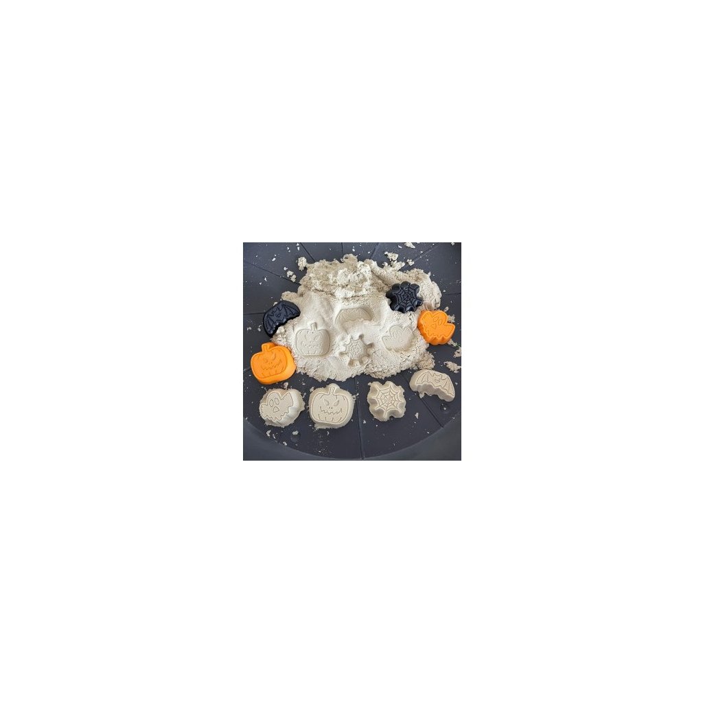 Stačí vzít hrst kinetického písku, vtlačit ho do bábovičky a hned vznikne malá dýně, netopýr nebo strašidlo a pavučina! Děti mohou kombinovat různé tvary, stavět strašidelné scénky, připravovat „halloweenské cukroví“ nebo hrát na malé čaroděje a čarodějky.