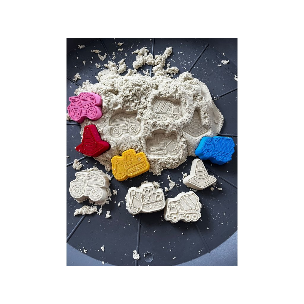 Stačí vzít hrst kinetického písku, vtlačit ho do bábovičky a hned vznikne sklápěčka, kužel, bagr nebo míchačka! Děti mohou stavět celé staveniště, kombinovat tvary a hrát na stavitele či stavební dělníky.