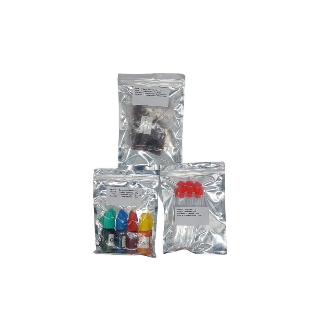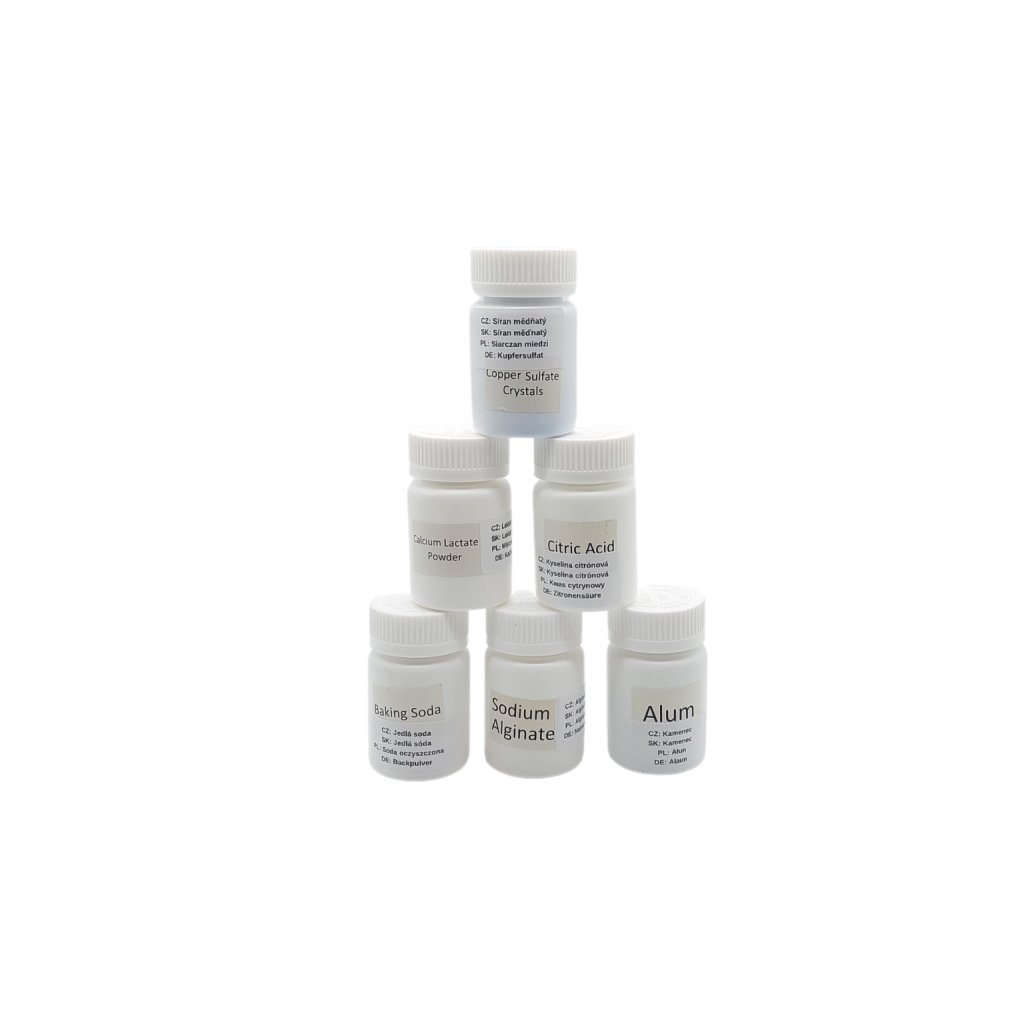 (jedlá soda, kyselina citronová, síran měďnatý, alginát sodný, kamenec…) - Barevné pigmenty (žlutá, zelená, modrá, červená)