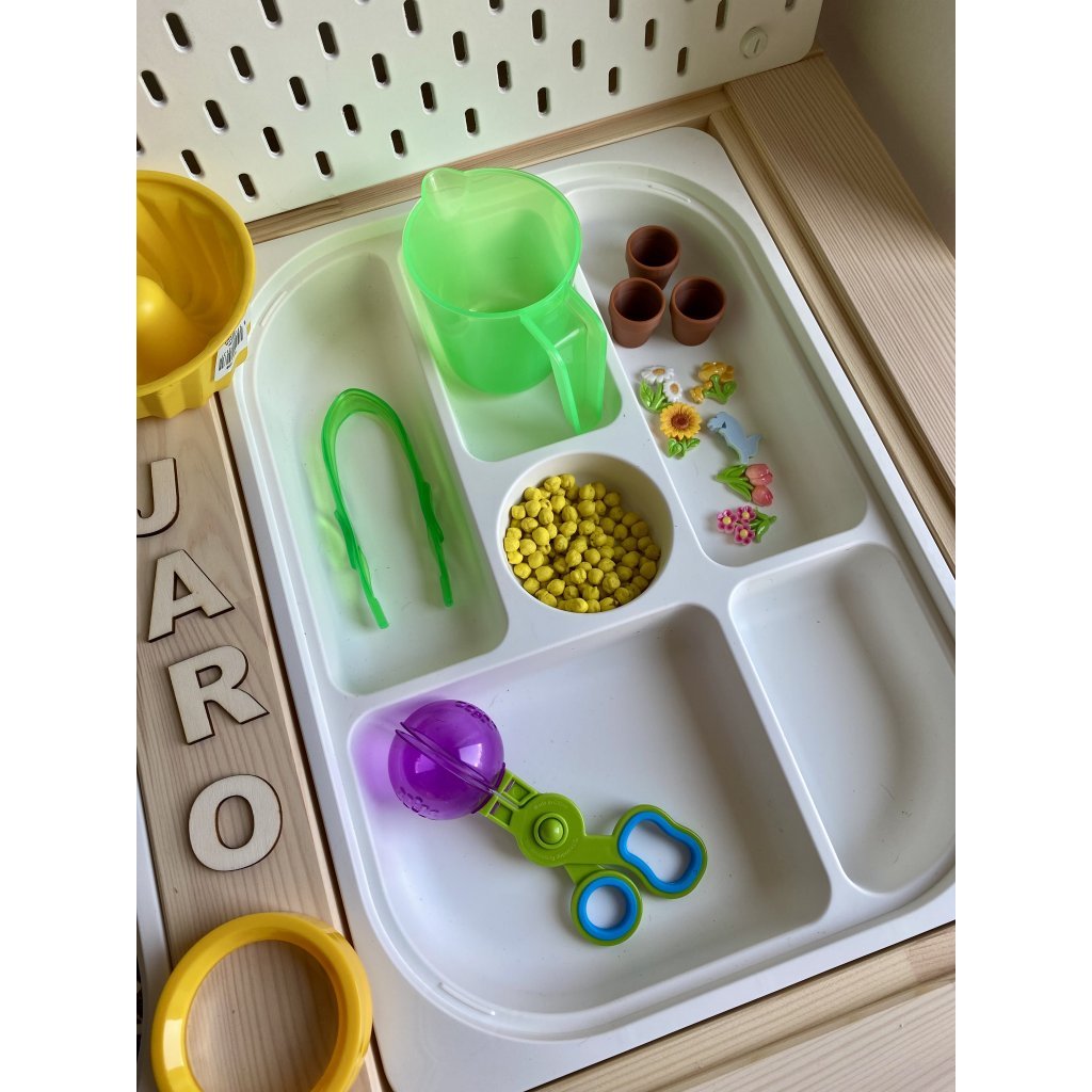 Jejich tvar napodobuje nůžky, takže děti trénují pohyb palce proti ostatním prstům – přesně ten, který se později používá při držení tužky. To znamená, že hra s naběračkami není jen zábava – je to přirozená příprava na psaní.