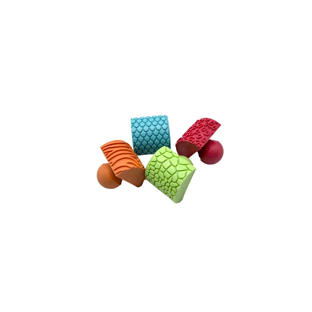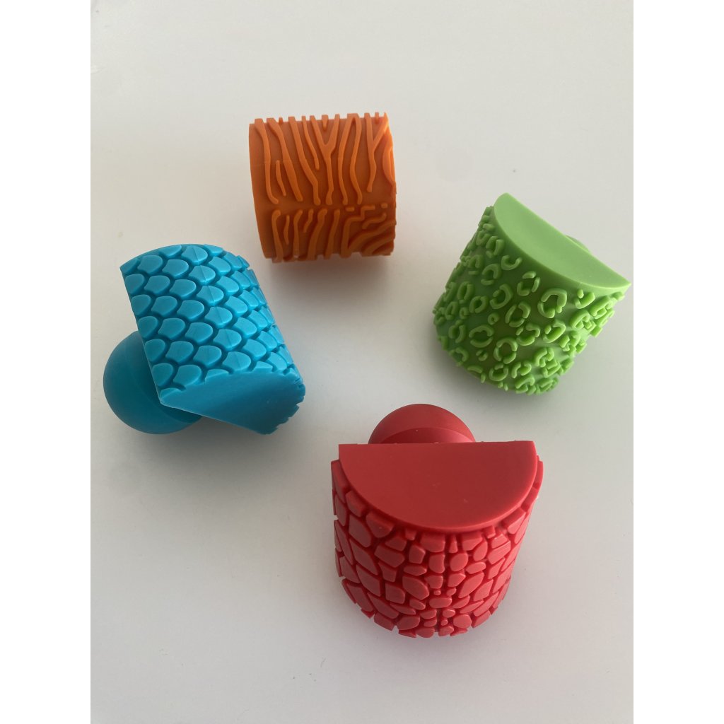 Objevte kouzlo smyslového tvoření pro děti! Tato sada obsahuje 4 texturová razítka s motivem zvířecí kůže, která dětem umožní zkoumat různé povrchy hravou a tvořivou formou.