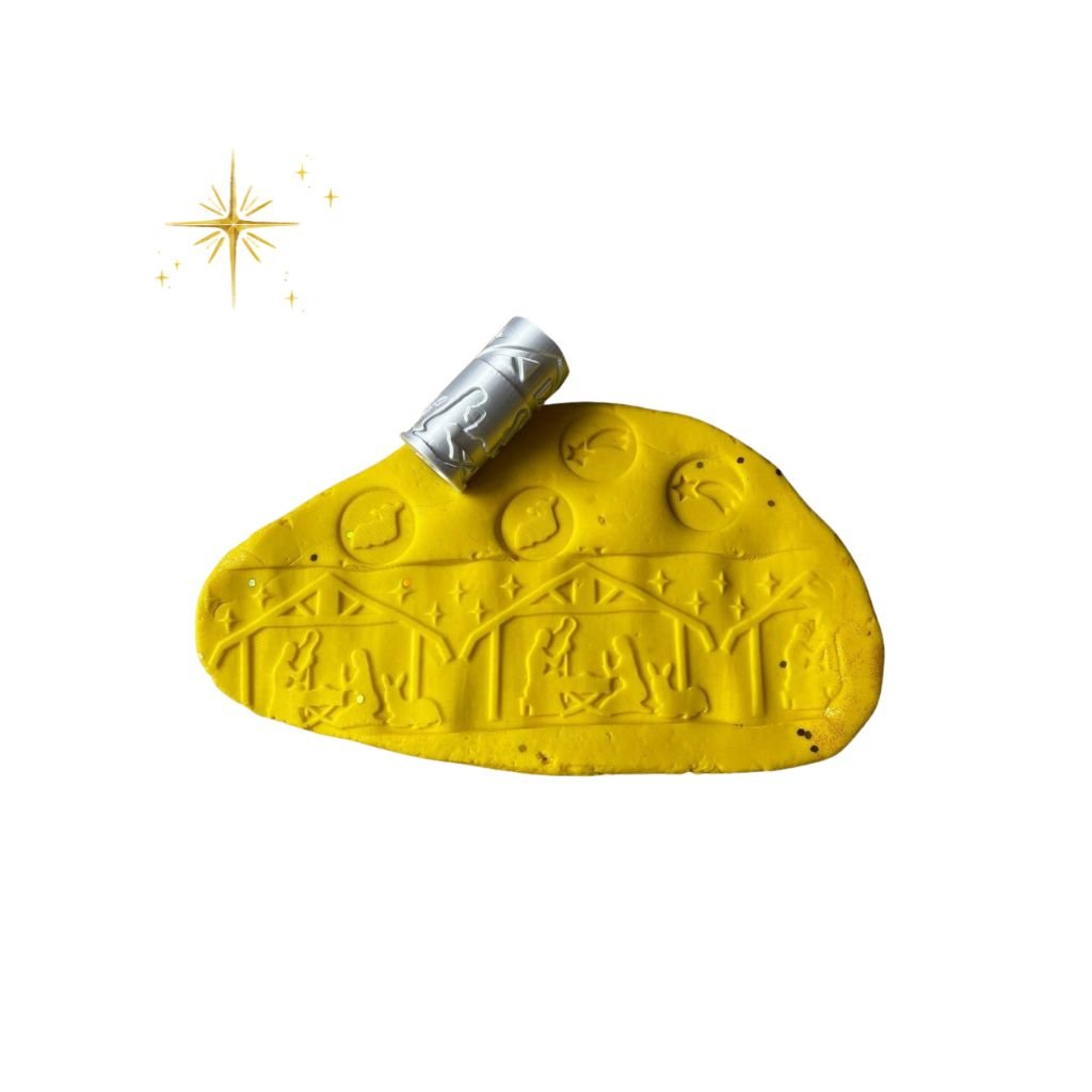 Otiskovací váleček s jemnými motivy jesliček, hvězd a malého Ježíška přenese do modelíny nebo kinetického písku klidnou vánoční atmosféru. Na koncích válečku najdeš kometu a ovečku jako razítka, která podpoří dětskou fantazii, vyprávění příběhů i jemnou motoriku.