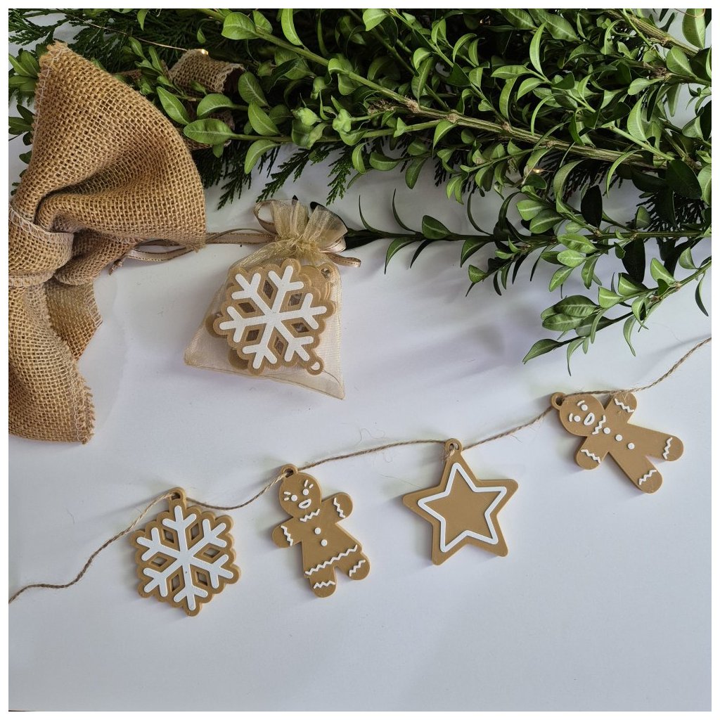 V sadě najdete 4 kusy malých perníčkových ozdob (5 cm) ůzných tvarů – každý perníček má navíc malé ouško, díky kterému ho můžete snadno navlékat na provázek, stuhu nebo gumičku. Děti si je mohou navlékat , tvořit vánoční girlandu nebo ozdobit svůj vlastní „vánoční stromeček“ při smyslové hře. Jsou ideální i jako milé překvapení a náplň do adventního kalendáře pro děti.