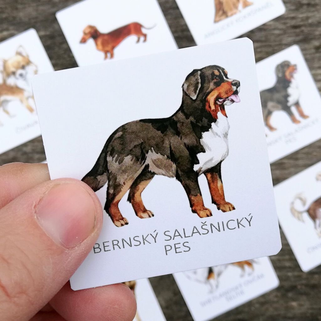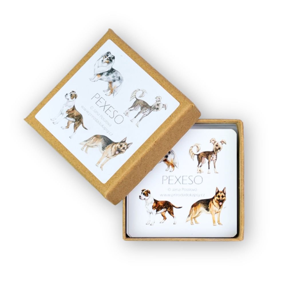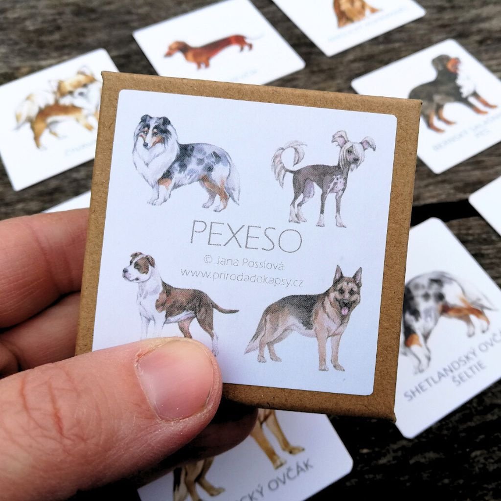 Pexeso Psi přináší 16 dvojic ručně malovaných pejsků – od malých chlupatých mazlíčků až po majestátní plemena.