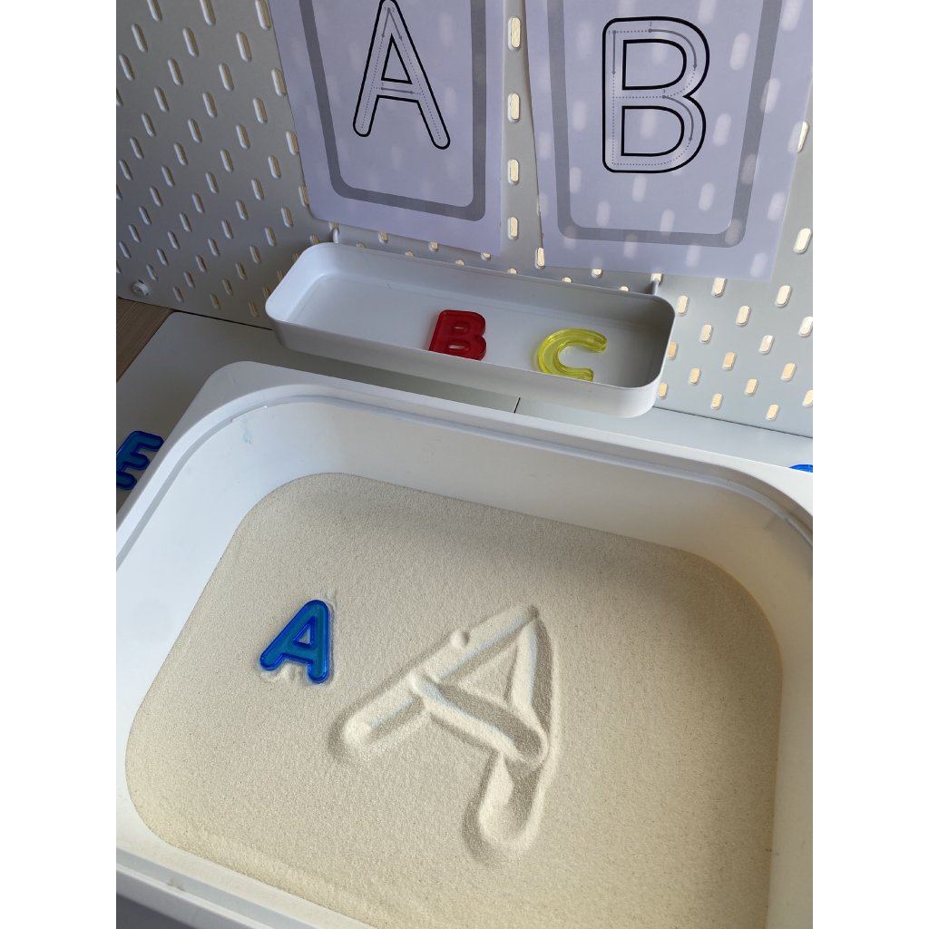 Použijte Light panel a nízkou nádobu, do které nasypete mouku nebo písek. Před tím položte předlohy písmen. Děti mohou prstíkem malovat po čarách a sledovat tvary písmen v osvětleném prostoru. Tato aktivita rozvíjí vizuální koordinaci a smyslové vnímání.