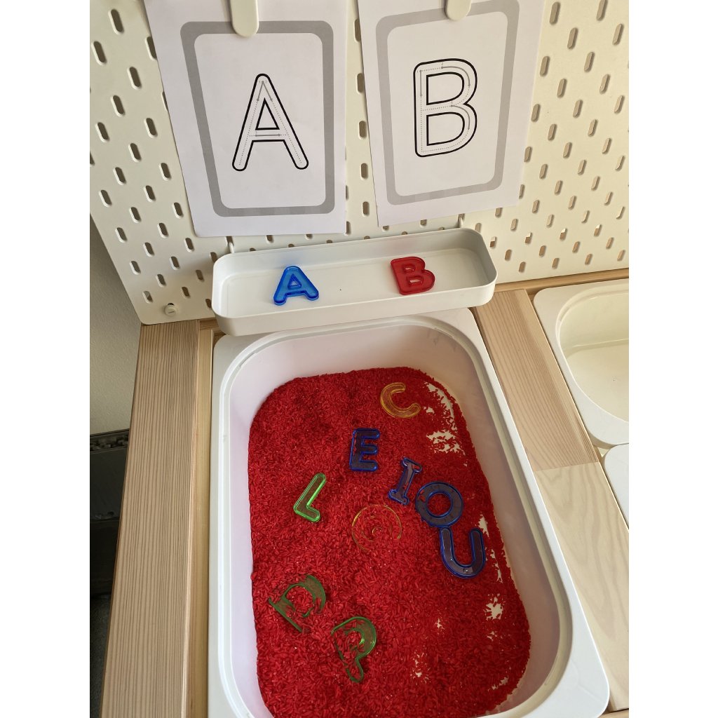 Nasypte do misky nebo nízké nádoby rýži, cizrnu nebo kinetický písek a schovejte tam plastová písmenka . Podle papírové předlohy budou děti písmenka hledat, vyndávat a porovnávat s předlohami. Tato aktivita podporuje hmotový cit ruky, soustředění a vizuální rozpoznávání písmen.