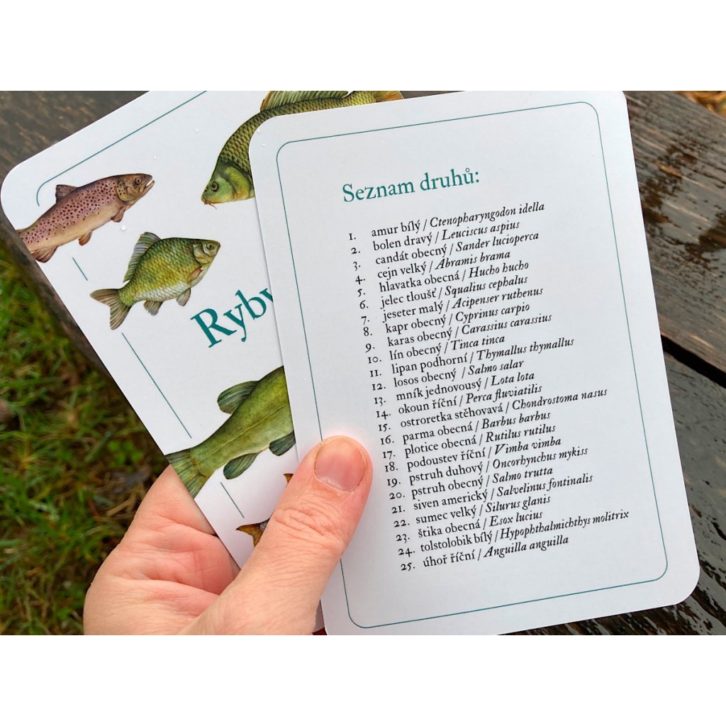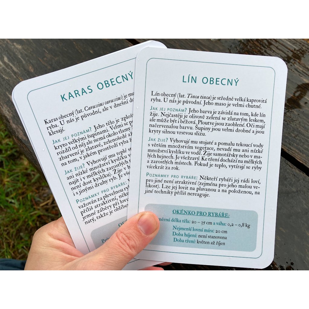 Karty jsou velmi vhodné také pro na základní škole a ve školkách. Soubor karet obsahuje 28 karet s ručně malovanými obrázky 25 druhů ryb, které u nás žijí.