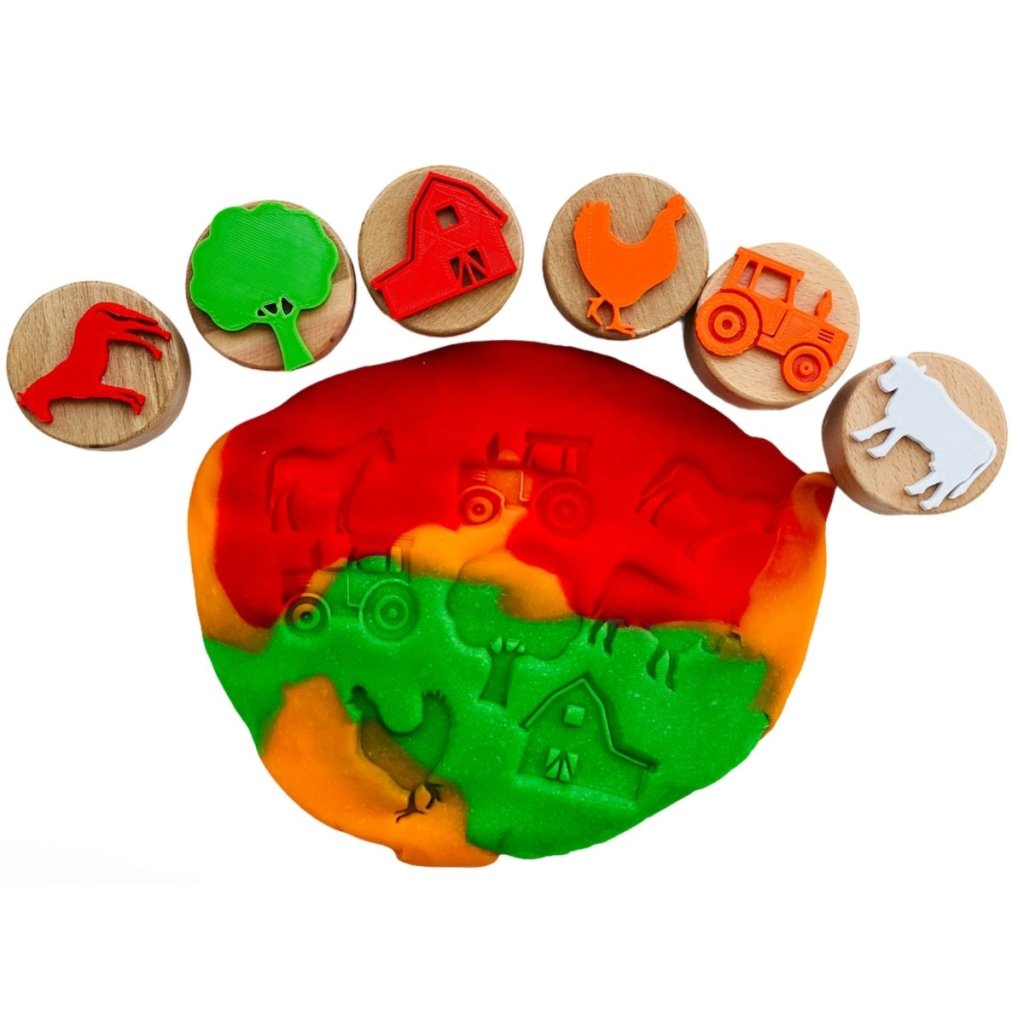 Vydejte se s dětmi na kouzelné farmářské dobrodružství s dřevěnou sadou razítek – Farma! Šest roztomilých motivů (kráva, kůň, slepice, prase, ovce, traktor) promění každou hru v kreativní farmu plnou zábavy. Ručně vyráběná razítka z bukového dřeva v kombinaci s 3D tiskem jsou bezpečná, odolná a ideální pro malé ručičky už od 15 měsíců. Perfektní pro hru s modelínou, kinetickým pískem.