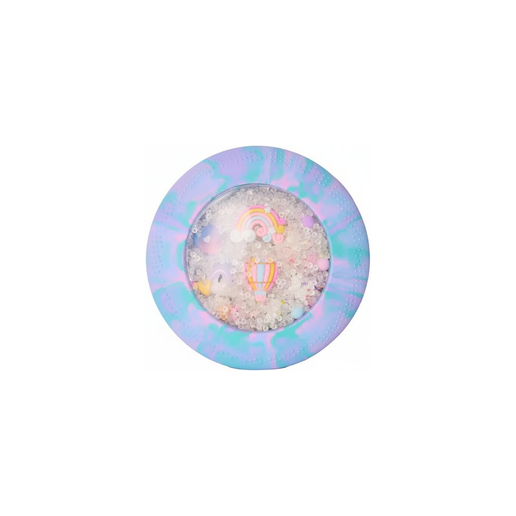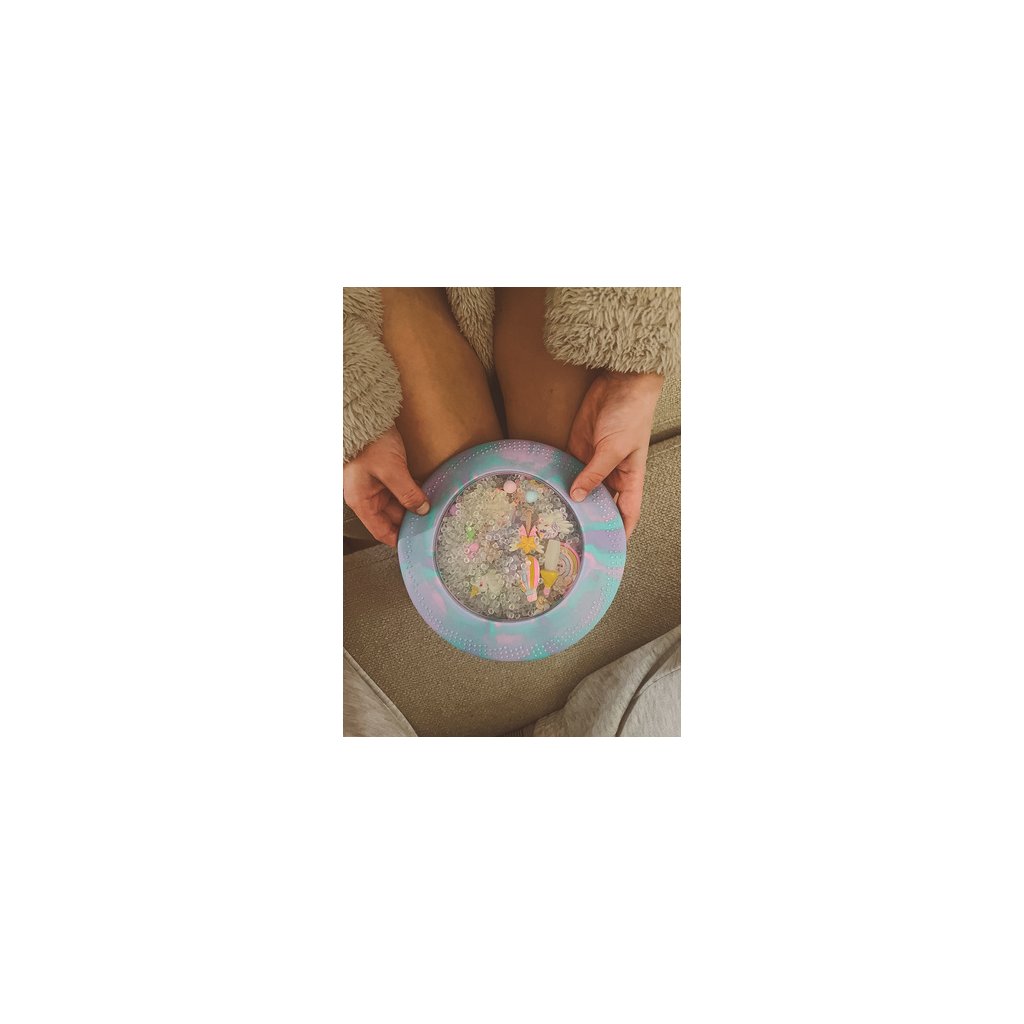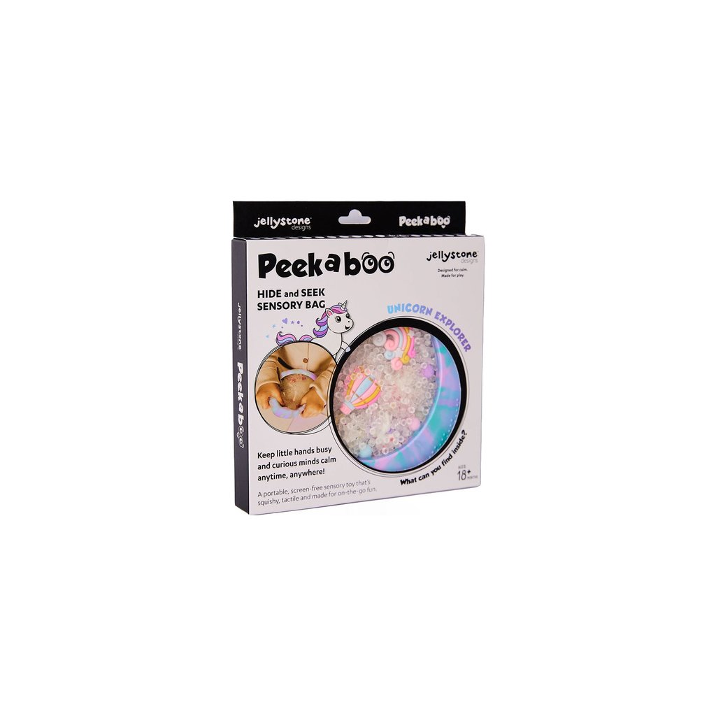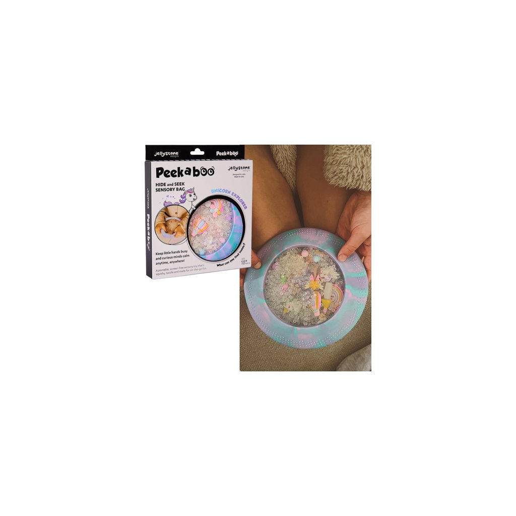 Peekaboo senzorický hmatový disk Jednorožci od Jellystone Designs je uzavřená smyslová hračka plná těžkých kuliček a roztomilých tematických figurek, které děti objevují úplně bez nepořádku. Stačí disk jemně zmáčknout – a hra „najdi jednorožce!“ může začít.