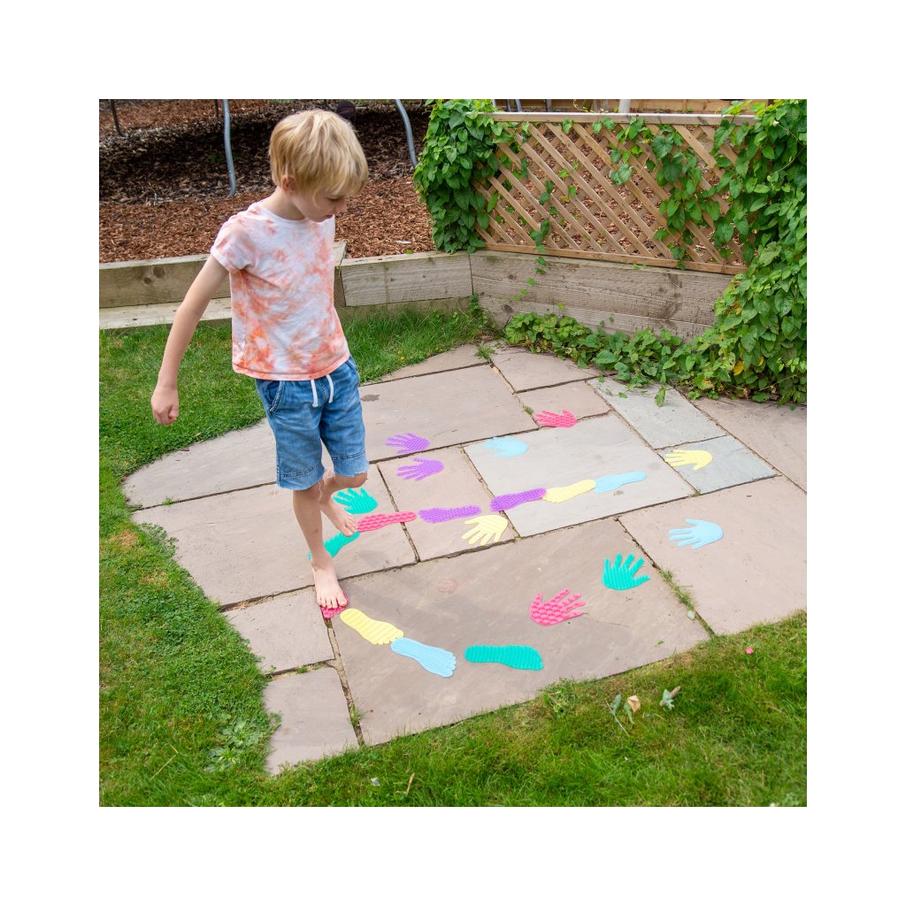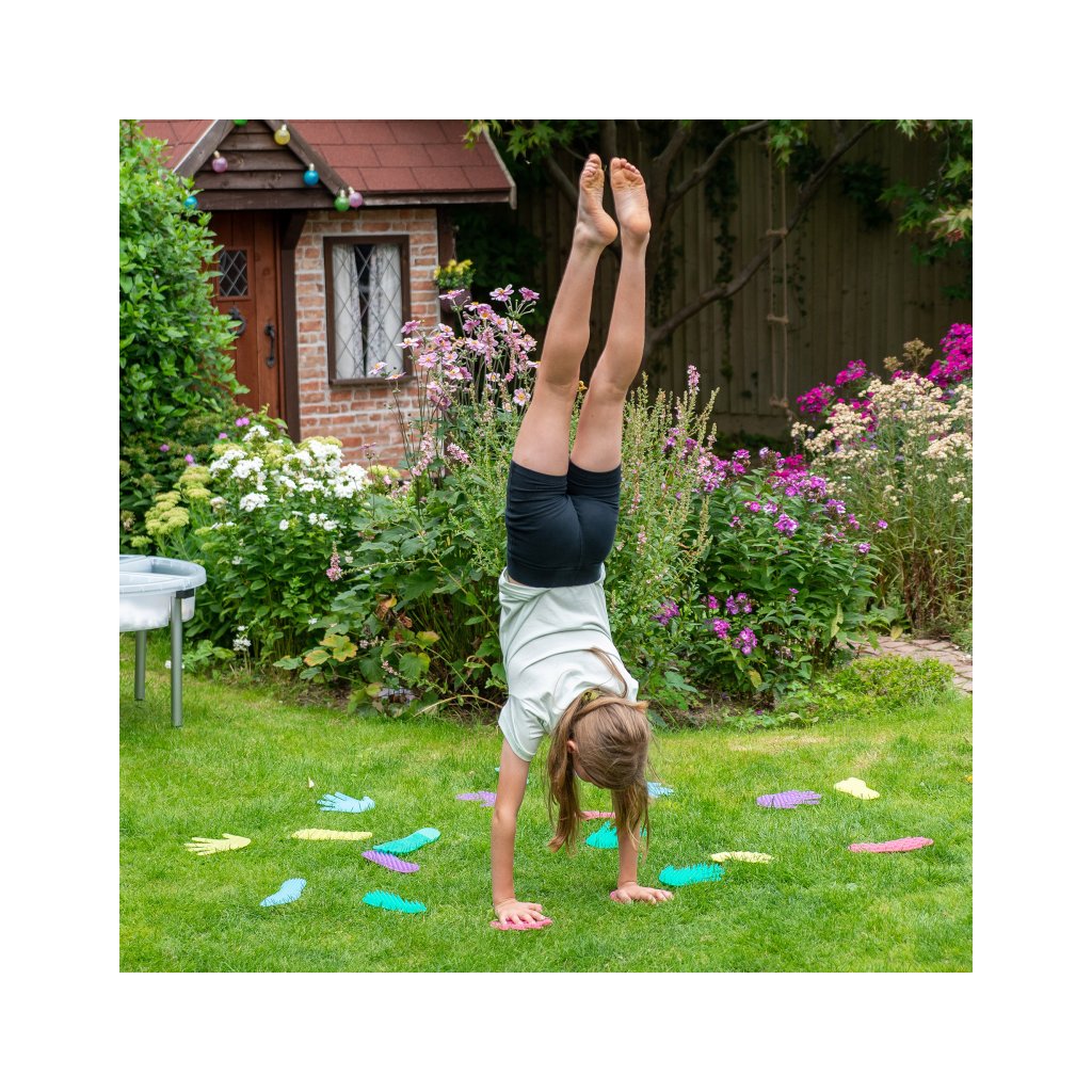 Díky 5 různým texturám děti objevují rozdíly mezi povrchy pomocí prstů, dlaní, chodidel i bosých nožek. Hra tak přirozeně zapojuje celé tělo a podporuje rozvoj rovnováhy, koordinace a hrubé motoriky. Tvary pevně přilnou k hladkým podlahám, takže jsou ideální pro pohybové hry, smyslové stezky nebo cvičení rovnováhy.