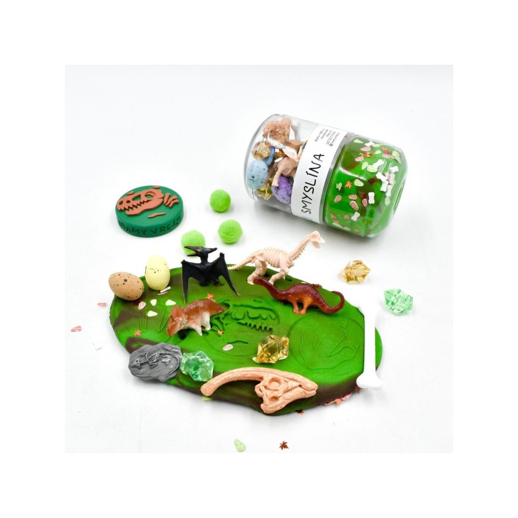 Vydej se do pravěkého světa plného kostí, stop a dávných obrů v jedné malé krabičce. Smyslína Svět dinosaurů v sobě ukrývá Mamolínu – domácí, měkkoučkou a voňavou modelínu – a sadu tematických doplňků, se kterými si děti vytvoří vlastní pravěký svět plný dinosaurů, zkamenělin, vajíček a tajemných stop. Stačí odšroubovat víčko a hra může začít.