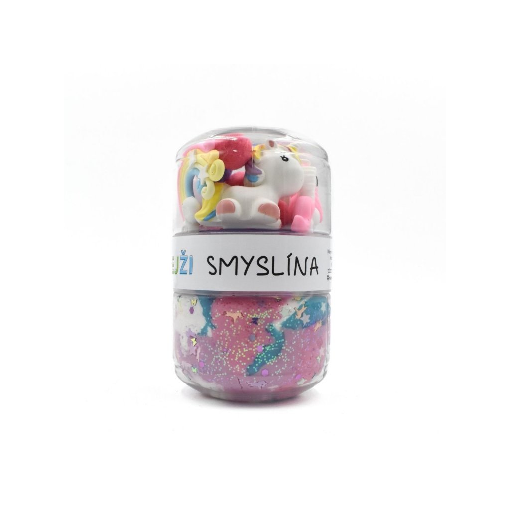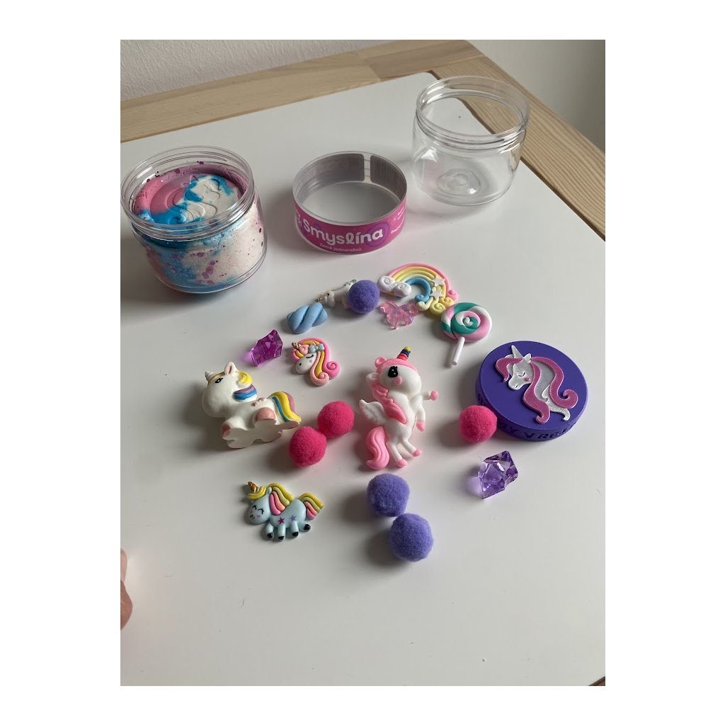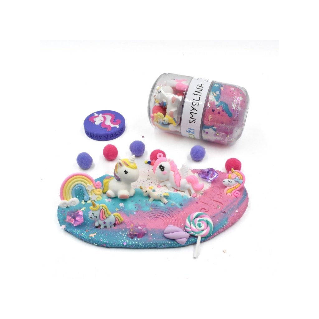 Vítejte v Zemi jednorožců, kde padají třpytky z oblohy a duhové stopy vedou do světa fantazie! Smyslína Země jednorožců v sobě ukrývá Mamolínu – domácí, měkkoučkou a voňavou modelínu – a sadu tematických doplňků, se kterými si děti mohou vytvořit vlastní pohádkový svět plný jednorožců, lízátek, hvězdiček a duhových příběhů. Stačí odšroubovat víčko a kouzla mohou začít.