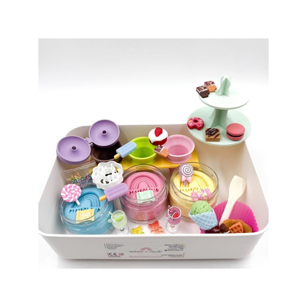 Děti od 3 let si mohou hravě tvořit vlastní dortíky, donuty, zmrzliny, makronky a další sladké dobroty z pastelových modelín. Box obsahuje vše, co malí cukráři potřebují: stojan na kornoutky, 3D donutovač, vykrajovátka, silikonové košíčky, poháry, bonbony a spoustu doplňků pro dokonalou cukrárenskou fantazii.