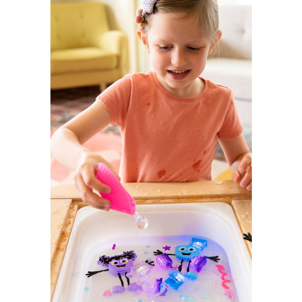 Kreativní smyslové hraní – Svítící kostky reagují na vodu, takže jsou ideální pro smyslové aktivity a hry rozvíjející jemnou motoriku, koordinaci oko–ruka i soustředění. Děti mohou kostky lovit nářadím Glo Pals, lžičkou, sítkem nebo pinzetou, a přitom si nenápadně trénují důležité dovednosti.