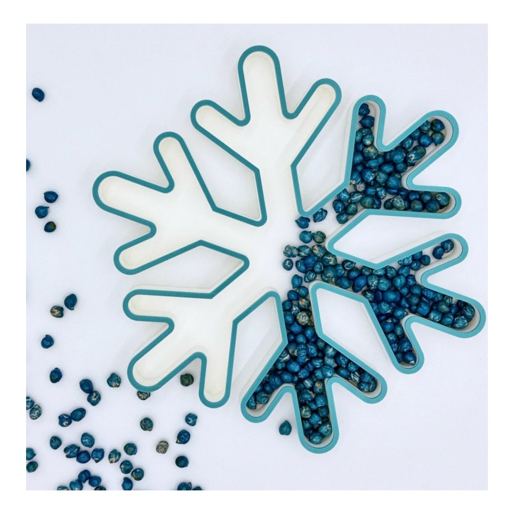 Třídicí a vysypávací tácek ve tvaru vločku je originální doplněk a pomůcka pro senzorické smyslové hraní. Je rozdělený do několika přihrádek, které si děti mohou samy naplnit různorodými materiály – třeba barevnou rýží, cizrnou, krystalky. Tácek využijete i na mokré smyslové hraní s vodními perlami nebo šumícími prášky. Rozvíjí smyslové vnímání, jemnou motoriku a dětskou představivost zábavným a přirozeným způsobem.
