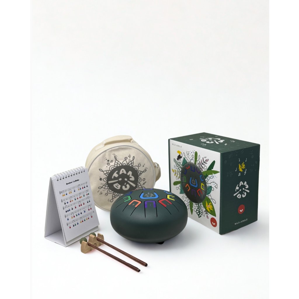 Tambú Jungle je originální kovový bubínek pro děti od 3 let, který otevírá dveře do kouzelného světa hudby inspirovaného džunglí. Je navržený tak, aby i úplní začátečníci mohli okamžitě hrát krásné melodie – každý tón zní harmonicky a příjemně. Děti si užívají hudbu bez frustrace, rodiče zase radost z jejich pokroků.