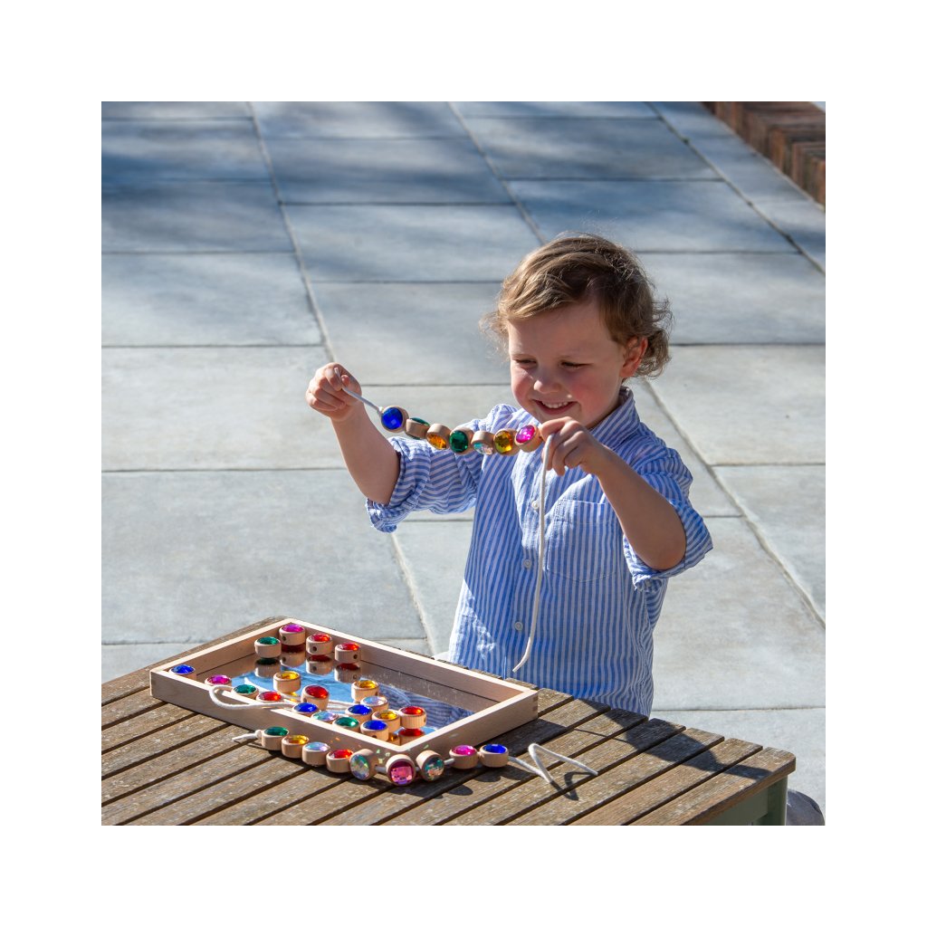 Objevte kouzlo třpytivých her s provlékacími drahokamy Tickit. Tento jedinečný set obsahuje 36 oboustranných akrylových drahokamů v pevném FSC® certifikovaném bukovém rámu, doplněných o 3 barevné šňůrky a praktický látkový pytlík na uložení. Drahokamy krásně odrážejí světlo a lákají děti k tvoření.