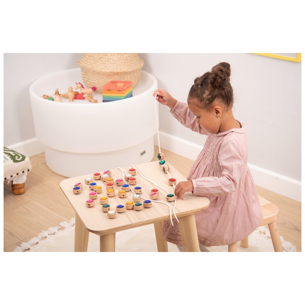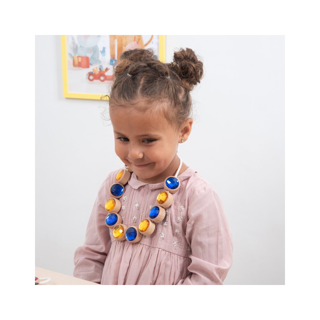 Děti si mohou vytvářet vlastní barevné řetízky, náramky nebo kouzelné náhrdelníky. Hra je nejen kreativní, ale zároveň podporuje rozvoj jemné motoriky, koordinace ruky a oka i trpělivosti.