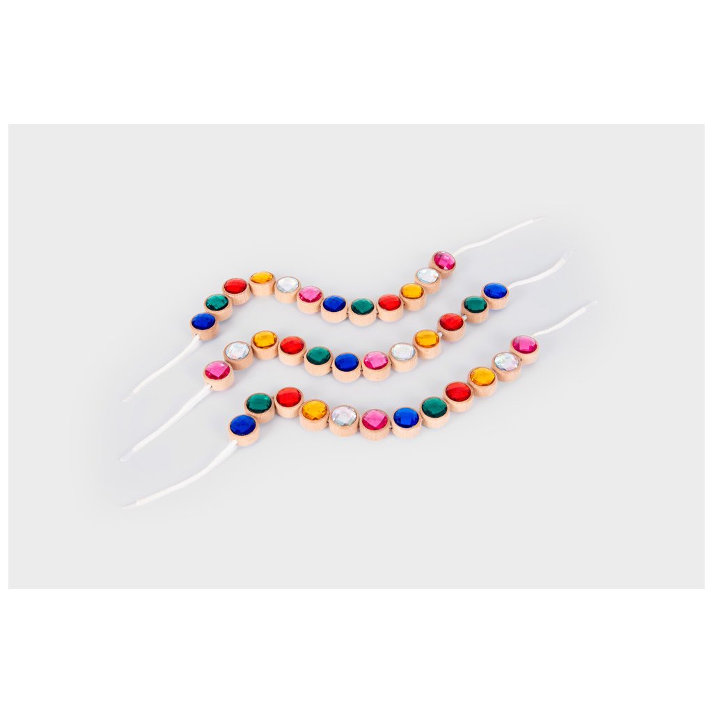 - Obsah: 36 drahokamů (6 barev – červená, zlatá, zelená, modrá, růžová, stříbrná), 3 šňůrky, látkový pytlík