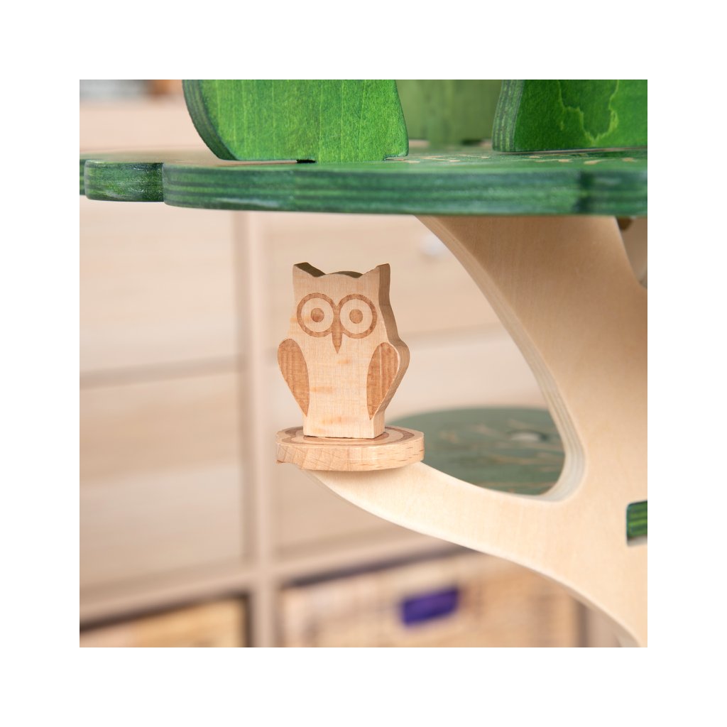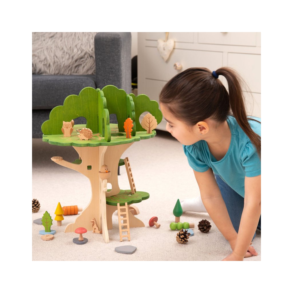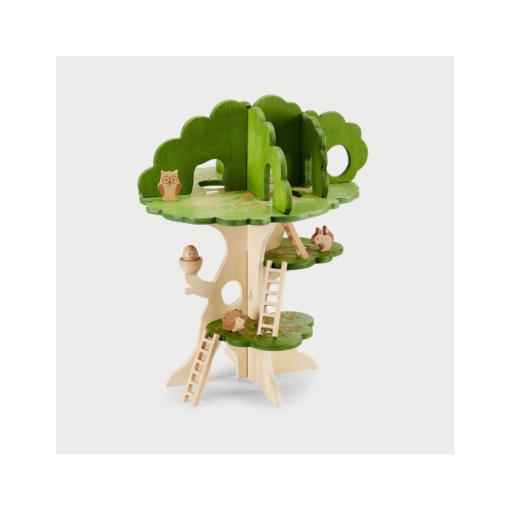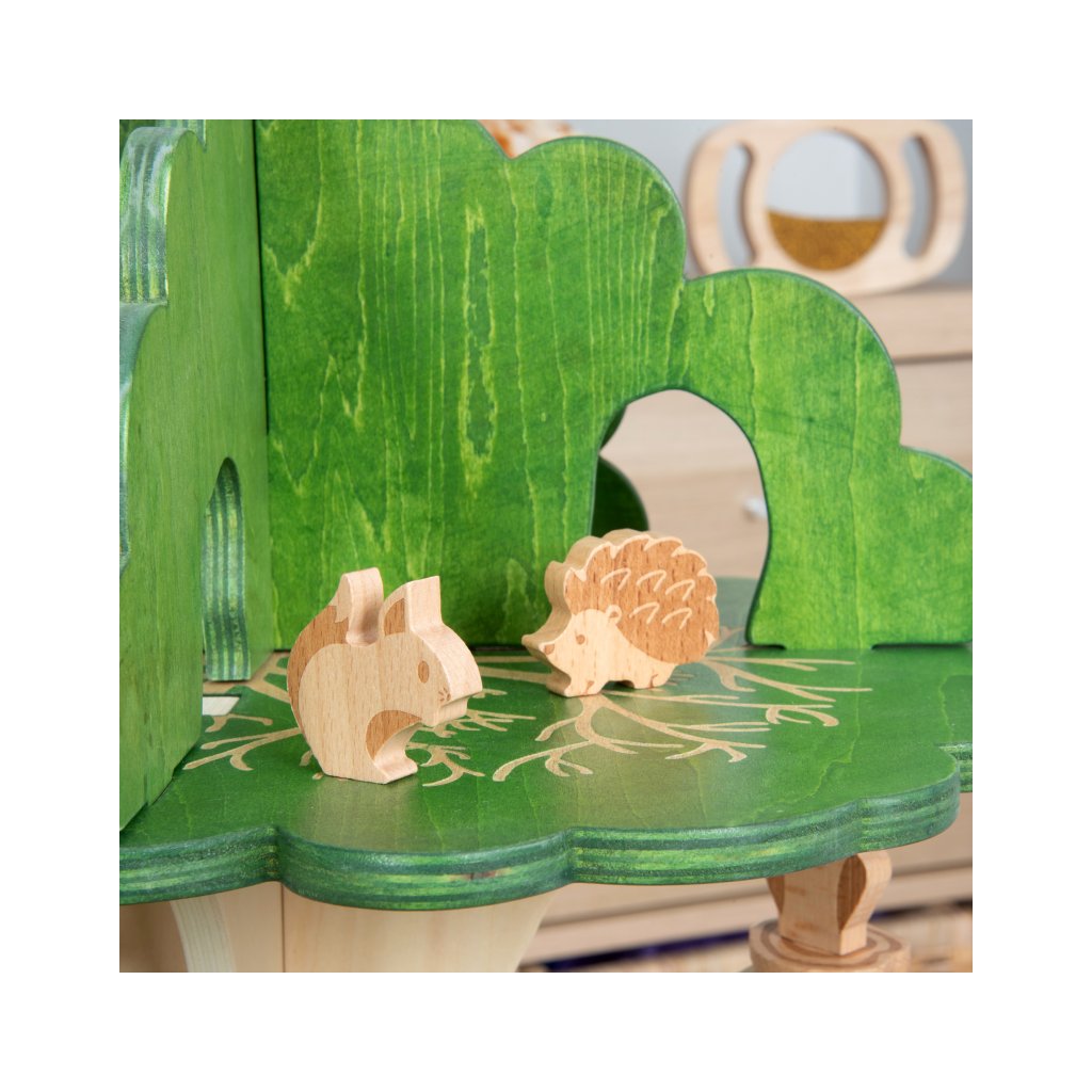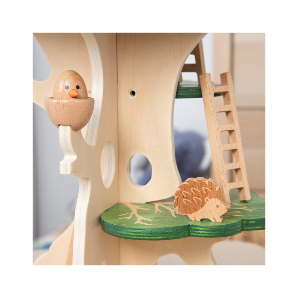 Součástí jsou i malí lesní kamarádi – sova, veverka, ježek a kulatý ptáček do hnízda. Děti si mohou vytvářet vlastní příběhy, přemisťovat zvířátka po jednotlivých patrech a zkoumat, kde se komu nejvíc líbí.