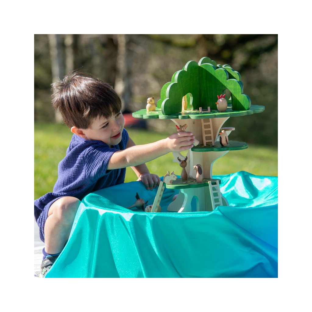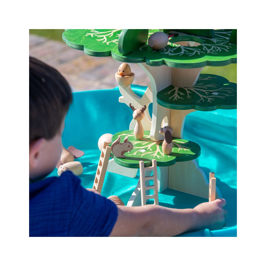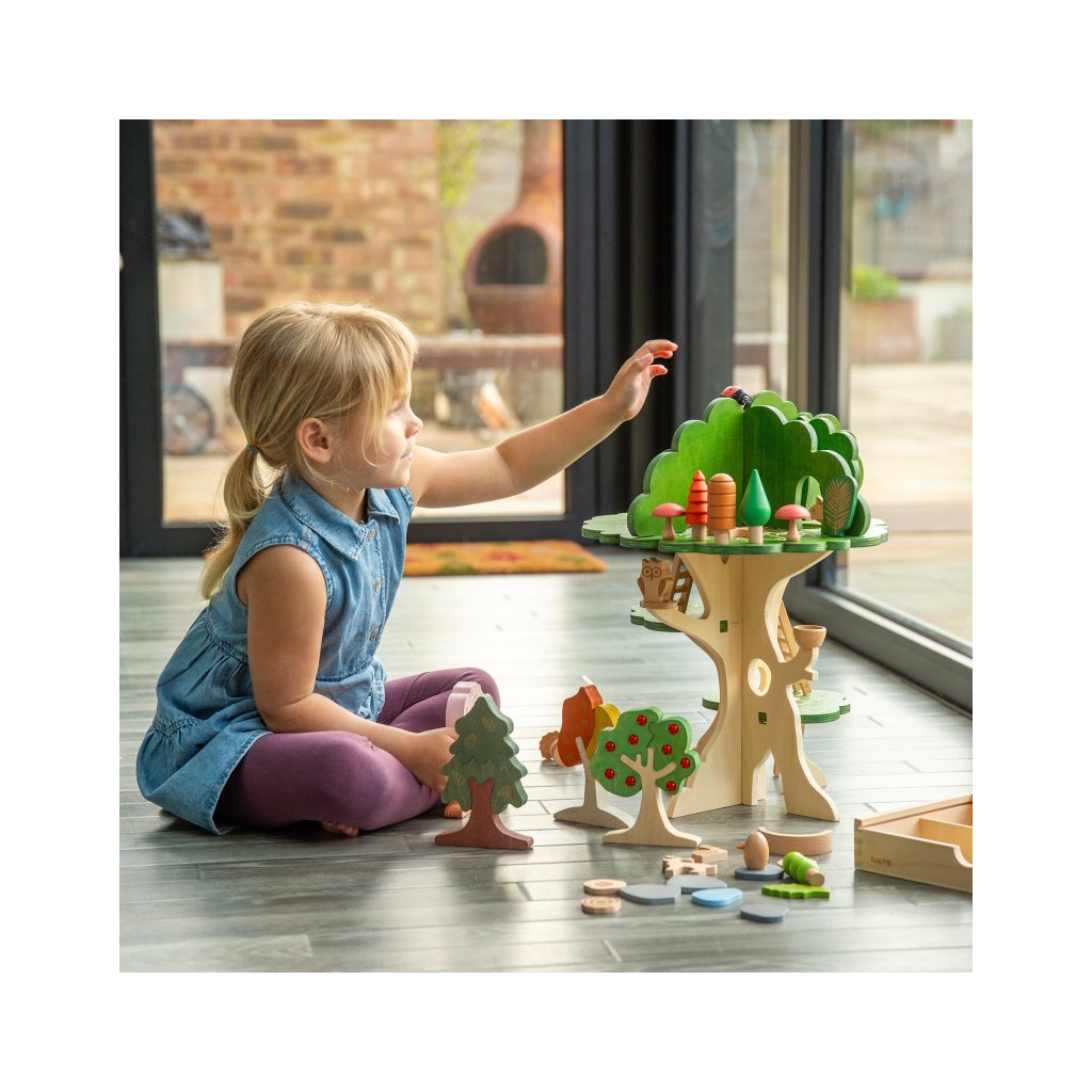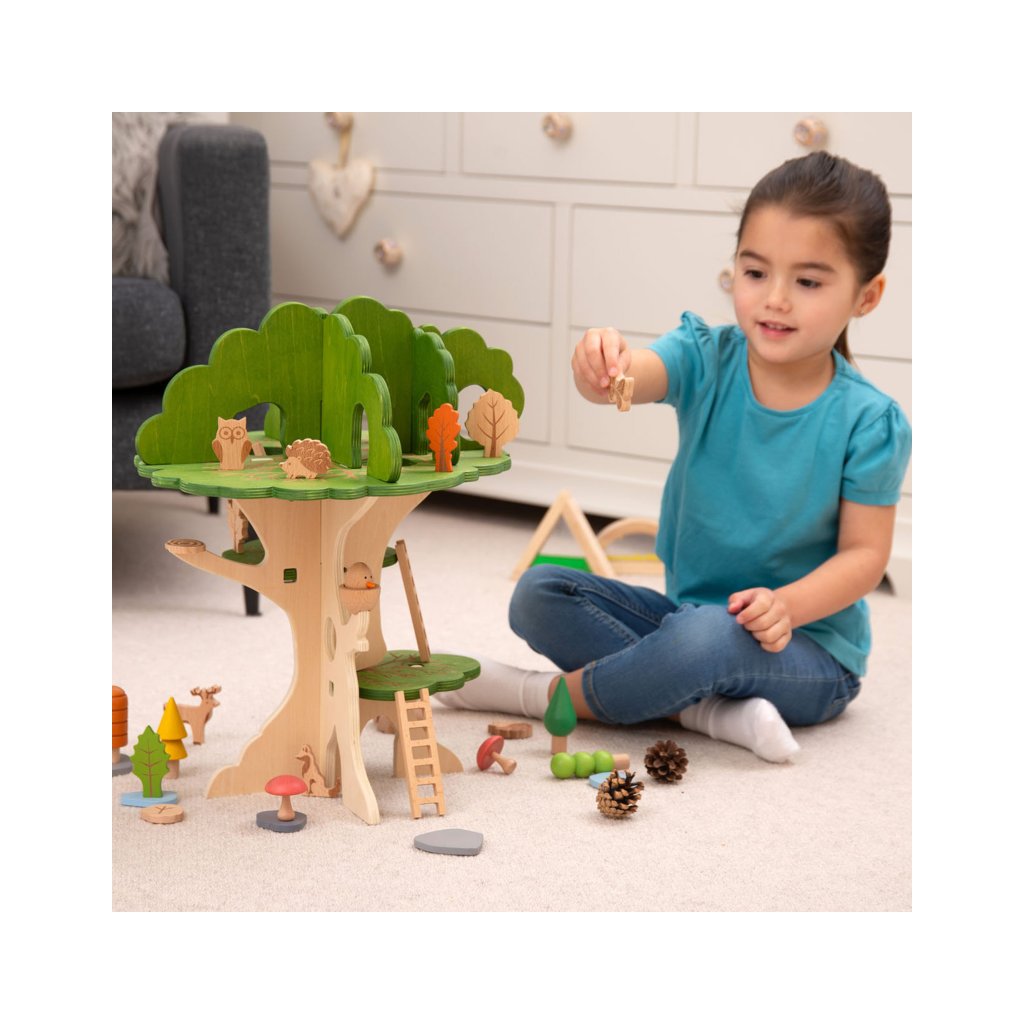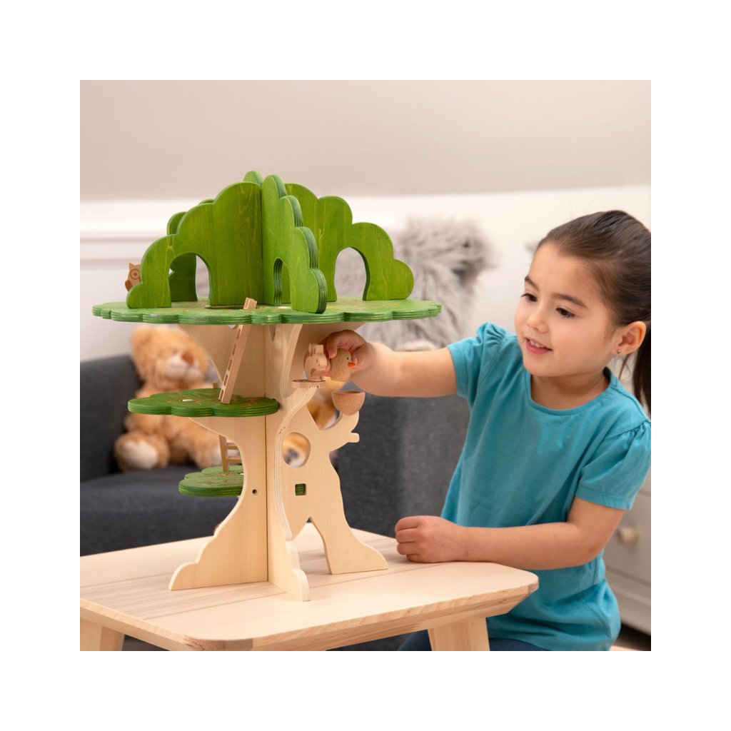 Součástí jsou i malí lesní kamarádi – sova, veverka, ježek a kulatý ptáček do hnízda. Děti si mohou vytvářet vlastní příběhy, přemisťovat zvířátka po jednotlivých patrech a zkoumat, kde se komu nejvíc líbí.