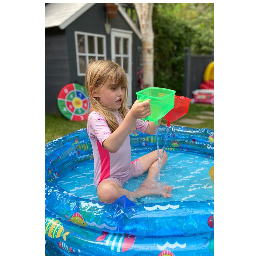 Hra s trychtýřem skvěle zapadá do konceptu smyslového hraní, které rozvíjí hmat, sluch i zrak. Děti při hře poznávají různé materiály – vodu, písek, drobné kamínky, vodní perly nebo třeba barevnou rýži. Zkoumají jejich strukturu, zvuk při sypání, chlad vody, šustění sypkého materiálu. Smyslové hry s vodou a pískem jsou skvělou podporou nejen pro rozvoj smyslů, ale také pro zklidnění a soustředění dětí – ideální volba pro hravé učení doma, na zahradě i v mateřské školce.