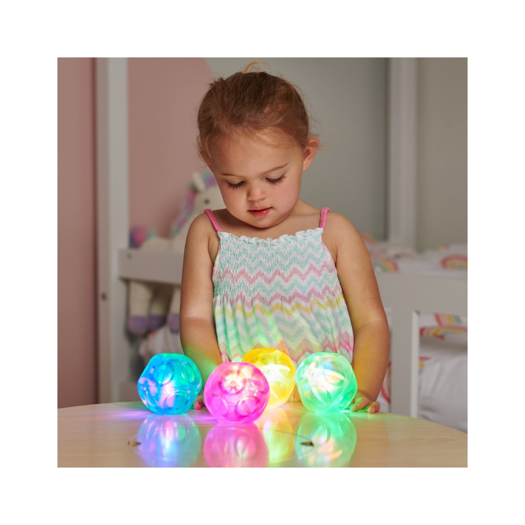 Senzorické blikající míčky TickiT přinášejí dětem radost, smích i fascinaci. Každý z těchto čtyř míčků (modrý, růžový, žlutý a zelený) skrývá LED světlo, které se při dopadu rozbliká a vytvoří kouzelný efekt. Díky nepravidelnému povrchu se míčky odrážejí nepředvídatelně – poskakují, mění směr a děti tak nikdy dopředu neví, kam poletí.