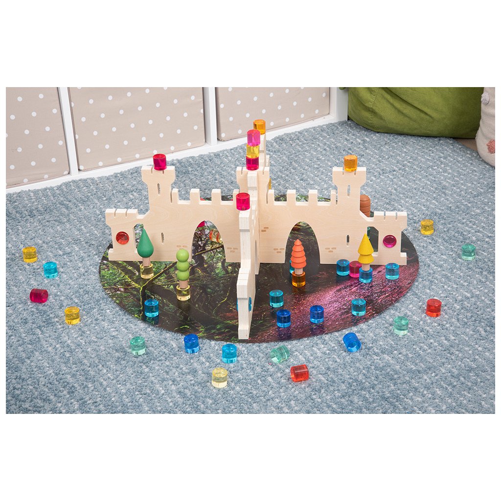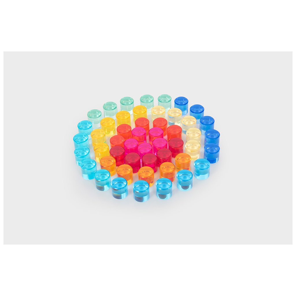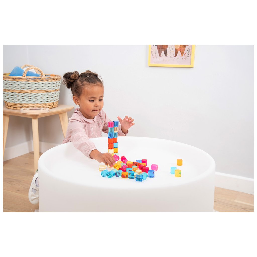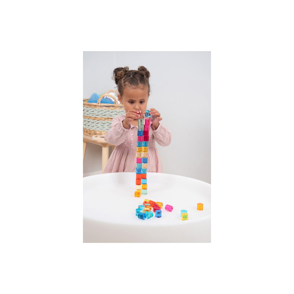 Barevné drahokamové válečky Tickit z křišťálově čirého akrylu okouzlí děti hrou se světlem a barvami. V sadě 50 kousků v 10 barvách mohou děti stavět, vyvažovat, zkoumat odlesky a míchat barvy. Ideální pro smyslové hraní, třídění i malé světy plné fantazie.