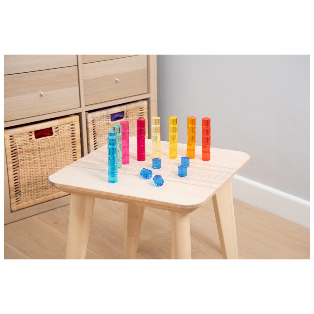 Hra se světlem – položte válečky na světelný Light panel nebo světelný stůl a sledujte, jak se jejich barvy prolínají a vytvářejí nové odstíny. Děti mohou vrstvit válečky na sebe a zkoumat kouzelné efekty.