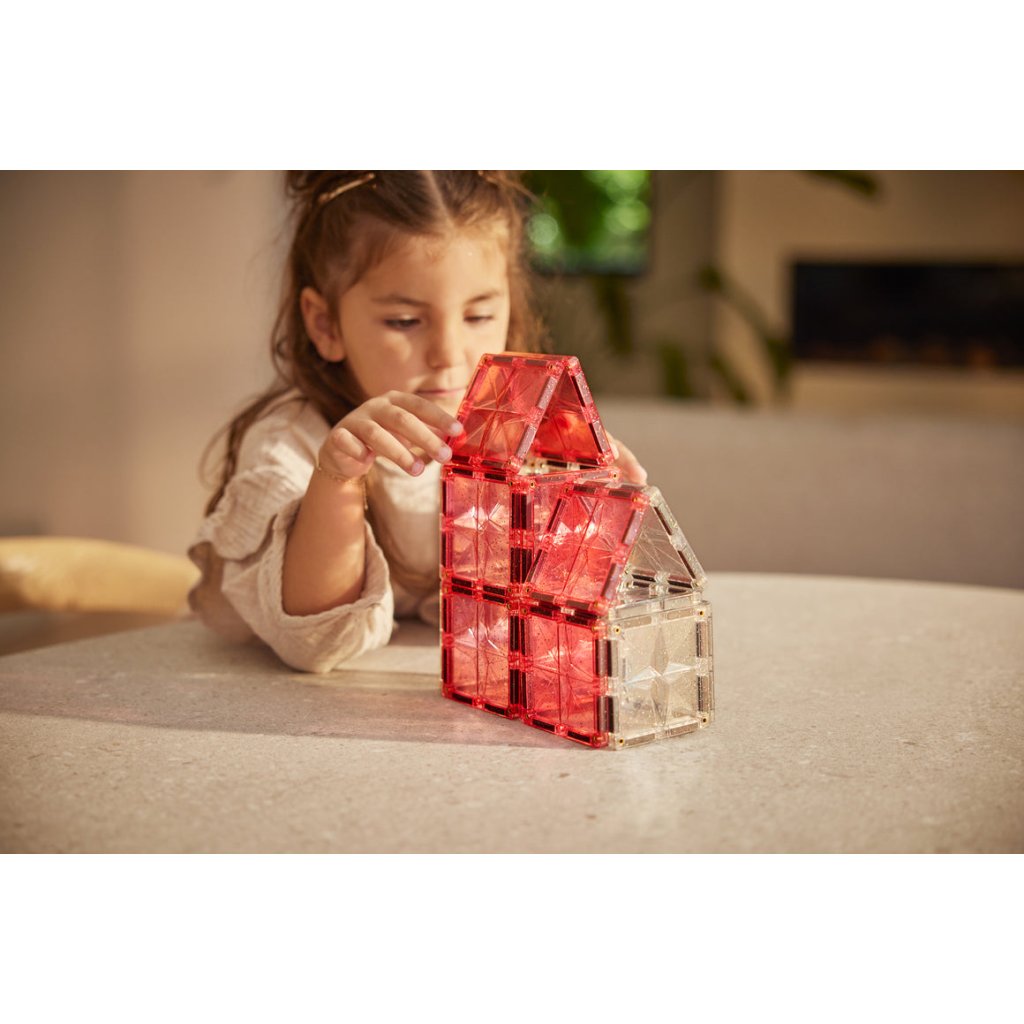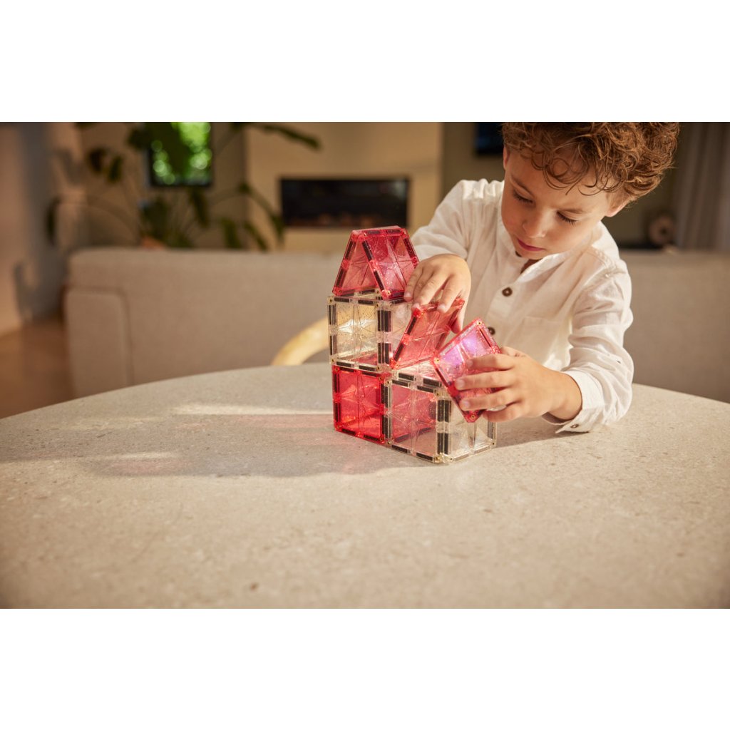 Třpytivá sada Cleverclixx v růžové a průhledné barvě rozvíjí nejen dětskou představivost, ale i jemnou motoriku, logické myšlení a prostorovou představivost. Díky kompatibilitě s magnetickými stavebnicemi (Connetix, Magna-Tiles, Coblo) mohou děti tvořit opravdu velkolepé stavby plné barev, třpytu a nápadů. Tato sada je ideální jako: