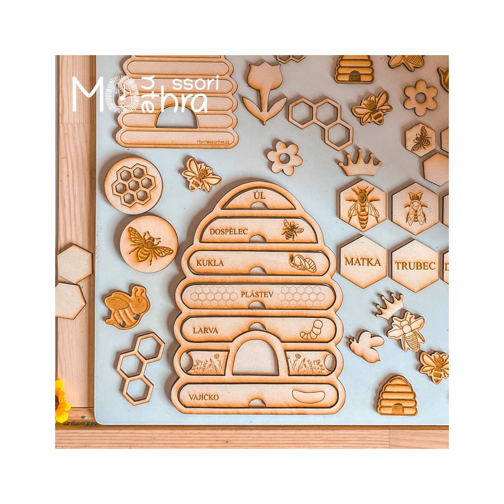 Tác slouží k učení se o hierarchii včelstva vkládáním edukačních dílků. Samozřejmě můžete také vysypávát smyslovým materiálem, či vytlačovat modelínou. Je pomůckou pro smyslové hraní nebo didaktickou pomůckou v montessori pedagogice. Podporuje koordinaci oko - ruka.