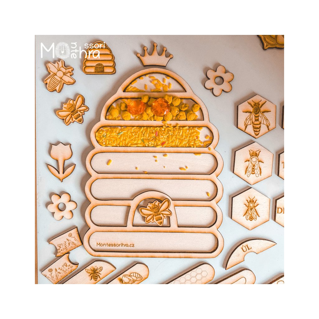 Třídící tác pro smyslové hraní - motiv VČELÍ Úl včetně vkládacích edukačních puzzle částí pro učení se o hierarchii včelstva