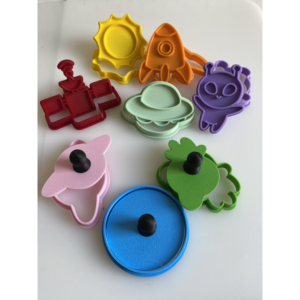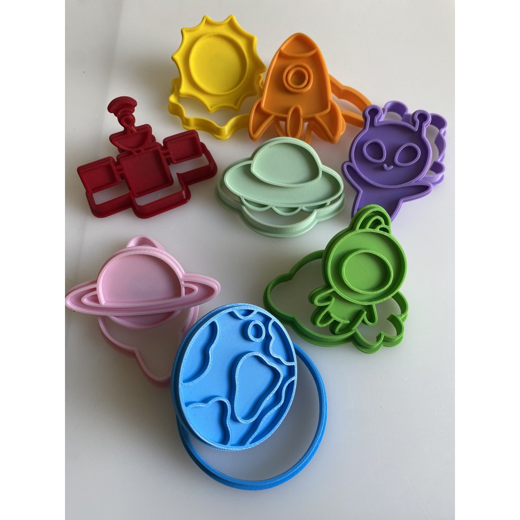 S touto dobrodružnou sadou vykrajovátek (razítko + okraj na vykrojení) děti vykouzlí vesmírný svět. Každé tvořítko funguje jako razítko i vykrajovátko, ideální ke hře s modelínou nebo kinetickým pískem. Vykrajovátka mají černou úchytku, která zlepšuje manipulaci. Skvělý doplněk pro malé milovníky vesmíru, který podpoří jemnou motoriku, fantazii a radost z tvoření!